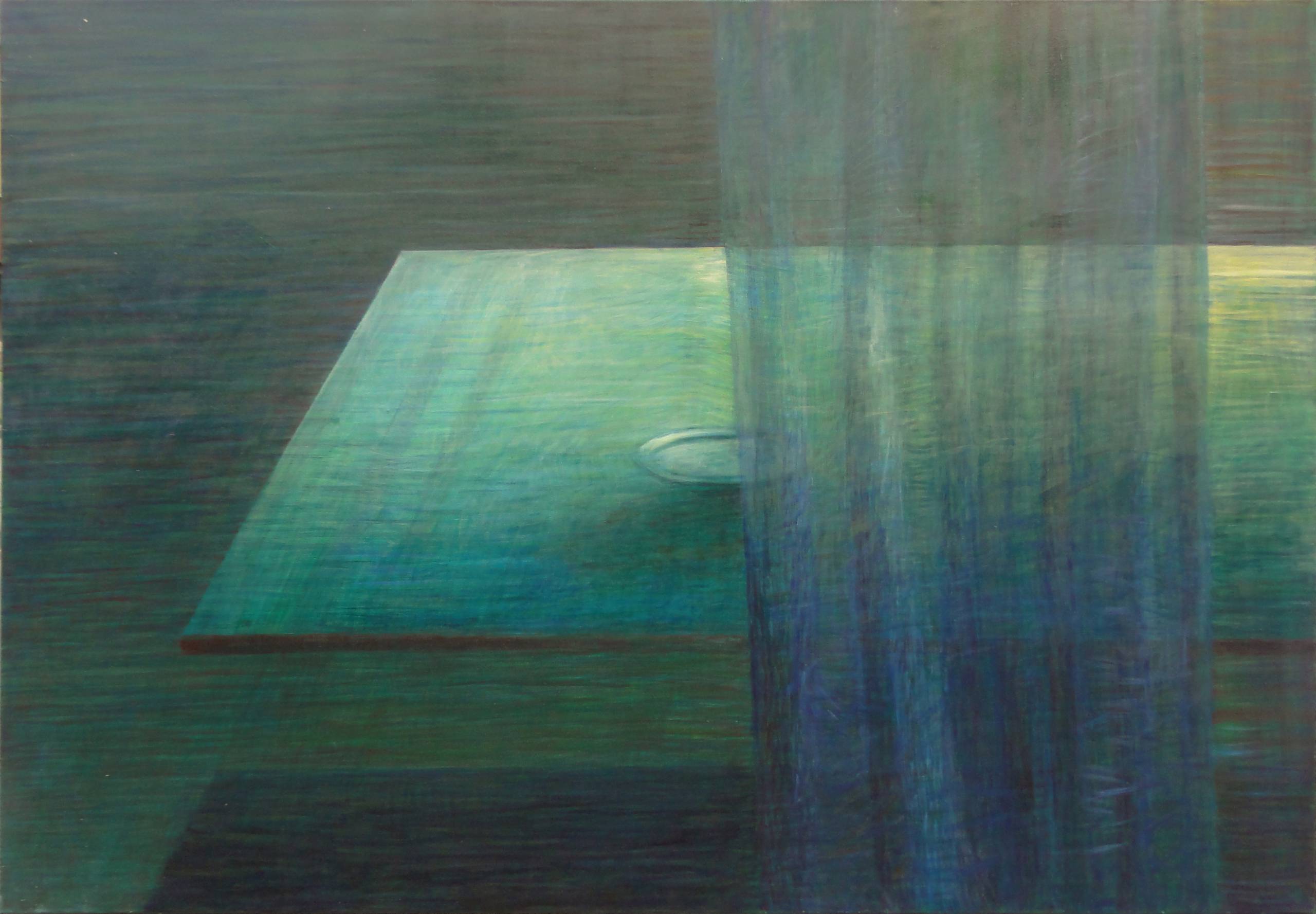 Na obrazie dominują odcienie zieleni i błękitu, które cudownie się przenikają, tworząc atmosferę tajemniczości i spokoju. Kompozycja wydaje się prostokątna, z delikatnym, półprzezroczystym pionowym elementem, który przypomina zasłonę. Czy to stół, czy coś zupełnie innego? Trudno powiedzieć, ale na pewno intryguje. Atmosfera jest oniryczna, jakby obraz miał własne życie, ukryte gdzieś za welonem kolorów. Artysta używa techniki mieszania tonalności, nadając dziełu głęboki, niemal trójwymiarowy efekt. Przenikanie się warstw farby sugeruje impresjonistyczny wpływ, choć całość jest zachowana w dość nowoczesnym stylu. To wygląda trochę jak magiczny stół! Wchodzi się w obraz jak w zupełnie inny świat. Taki pełen spokoju i delikatnych emocji. Może symbolizować kontemplację, chwilę refleksji, a może po prostu ucieczkę od codzienności – taki pure escapism. Jest coś w tym dziele, co sprawia, że człowiek chce zostać, choć na chwilę dłużej. I patrzeć.