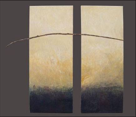 Obraz przedstawia dwa pionowe prostokąty, które łączą się poprzez cienką, ledwo zauważalną linię przypominającą gałązkę. Dominują tu pastelowe odcienie beżu i żółci, które na dole płynnie przechodzą w ciemniejsze tony – może to granat, a może głęboka zieleń. Kompozycja jest prosta, prawie minimalistyczna, lecz nie nudna. Ma w sobie coś tajemniczego. Atmosfera jest spokojna, trochę melancholijna, a jednocześnie w jakiś sposób podnosząca na duchu. Czujesz, jakby obraz delikatnie szeptał do Ciebie o poranku przed burzą. Styl jest chyba abstrakcyjny, z pewnością impresjonistyczny w delikatności i ulotności formy. Artystyczna technika to subtelne mieszanie kolorów i faktur. Może to olej na płótnie, a może inny medium, kto wie. Emocje? No cóż, każdy może zobaczyć tu coś innego. Dla mnie jest to cisza o poranku, kiedy natura dopiero zaczyna budzić się do życia. A może to horyzont nad wielkim oceanem? W każdym razie, obraz zrywa z rutyną prostymi formami i łagodnym przejściem barw. Czy warto go mieć na ścianie w salonie? Absolutely! Ma coś w sobie, co nie pozwala przejść obok obojętnie. Myślę, że nawet dziecko mogłoby powiedzieć: „To jak dwa okna do bajki!” Deska z gałązką sprawia, że całość wydaje się organiczna, jakby była częścią większej, niezrozumiałej jeszcze opowieści.
