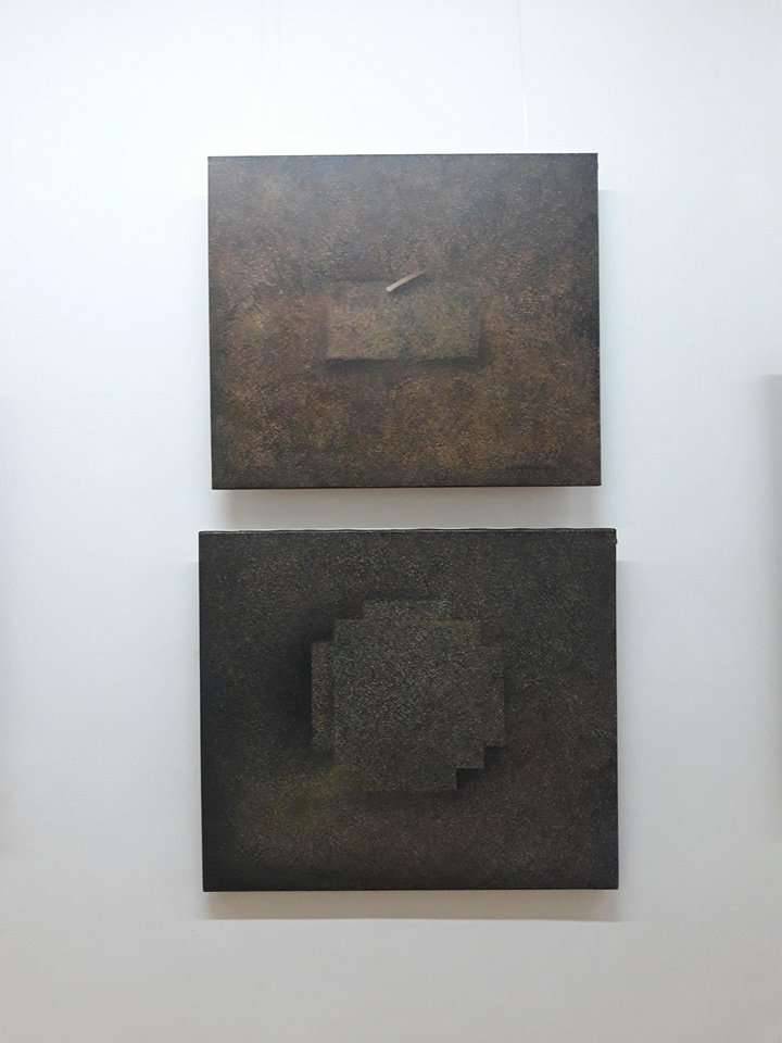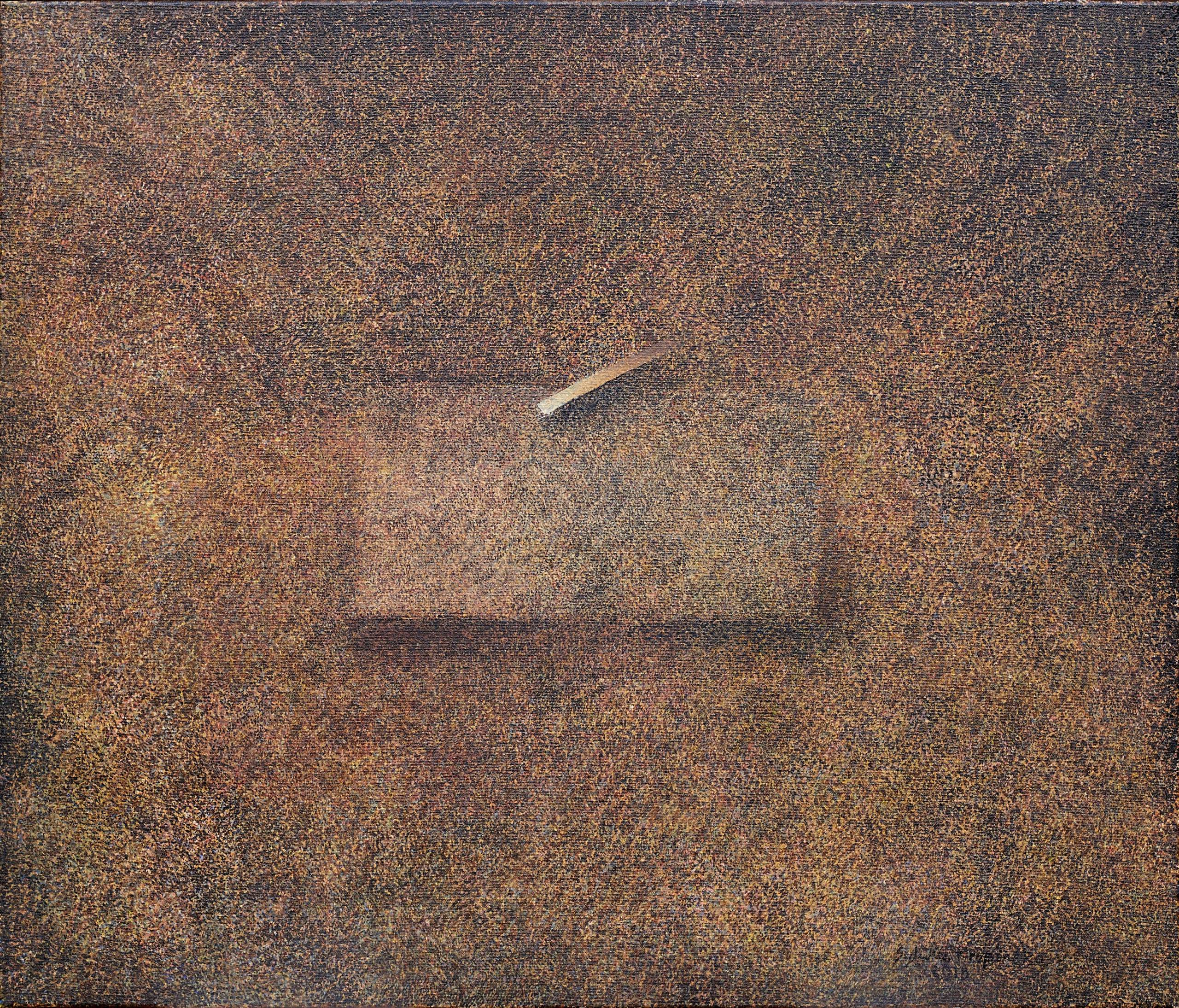 Obraz emanuje ciepłymi, ziemistymi tonami, wypełniając przestrzeń bogactwem odcieni brązu, złota i delikatnej czerwieni. W centrum dostrzegamy prostokątną formę, jakby fragment zatartej kreski, ledwie widocznej w wirującym chaosie punktów. Ta technika, przypominająca pointylizm, tworzy złudzenie głębi i ruchu. Artysta zdaje się bawić odbiciami światła, co nadaje dziełu mistyczny, almost magical feeling. Wygląda to trochę jak błyszczący pył na starym, zapomnianym przedmiocie. Taki obraz pobudza wyobraźnię; może to być wszystko i nic. Czy to ukryta historia, jak skarb zostawiony przez czas? Nastrój dzieła jest tajemniczo spokojny. Nieco melancholijny, ale i kojący. Patrząc na obraz, można poczuć nostalgię za czymś nieuchwytnym. Przypomina mieszaninę wspomnień z przeszłości, które dawno zblakły. Heck, gdy pomyślę, że to tylko plama na kartce, czuję się, jakbym odkrywał tajemnicę. Myślę sobie, że każdy widzi tu coś innego. Ja widzę skarb pełen historii. Fascynujące, jak artysta potrafi przenieść na płótno takie bogactwo emocji. Jakby każdy z tych małych punktów miał swoją własną duszę. Zaskakująco intymne i głęboko poruszające w swej prostocie.