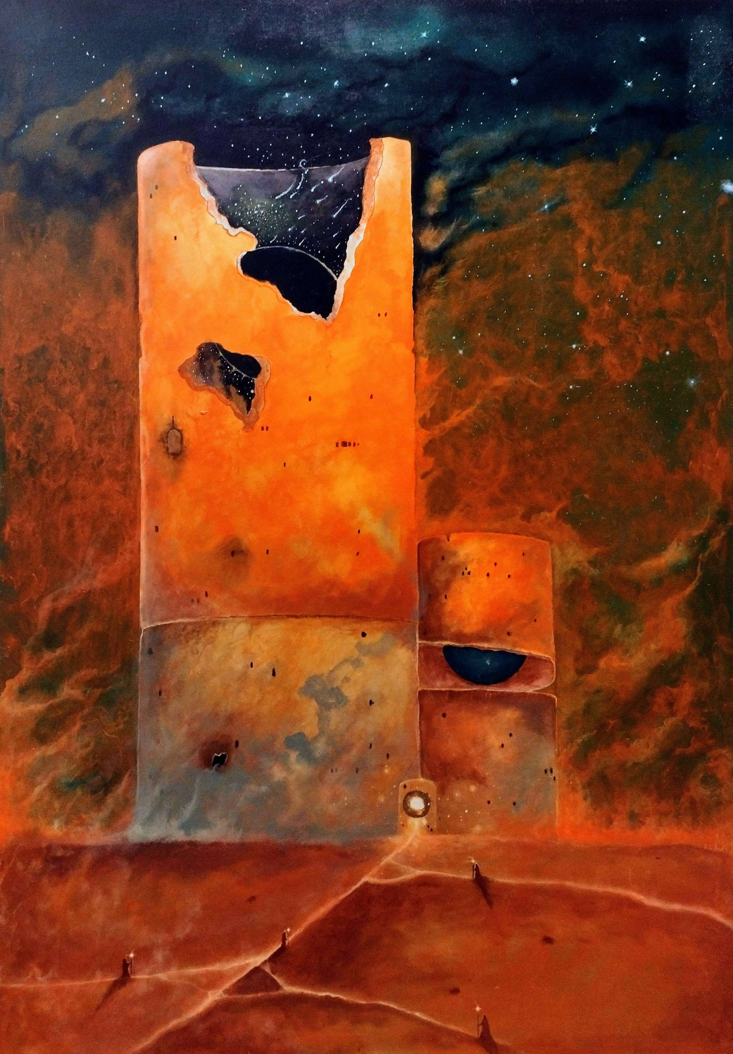 Obraz ukazuje surrealistyczną kompozycję dominującą przez gigantyczne, pomarańczowo-rdzawe struktury przypominające wieże. Na ciemnym, gwiaździstym niebie rozciąga się tajemniczość kosmosu. Kolory łączą ciepłe odcienie z głębokimi, ciemnymi tonami, tworząc kontrast, który przyciąga wzrok. Atmosfera dzieła jest niemal oniryczna, pełna zagadek i nieoczywistości, emanując poczuciem izolacji. Wygląda to jak scena ze snu, gdzie to, co znajome, miesza się z obcym. Artysta zastosował techniki mieszane, nadając strukturze teksturę i głębię. Widać w tym wszystkim styl bliski science fiction. Wizja ta pobudza wyobraźnię, zmuszając do zadawania pytań o naturę przedstawionego świata. Obraz może wywoływać u widza emocje niepewności czy intrygi, ale też fascynacji. "Wow, jakie to duże, prawie jak nasz dom!" – powiedziałoby dziecko. Osobiście, czuję nostalgię za miejscami, których nigdy nie odwiedziłem. Ten obraz to escape into the unknown, gdzie każdy detal skłania do refleksji nad kosmosem i naszym w nim miejscem.
