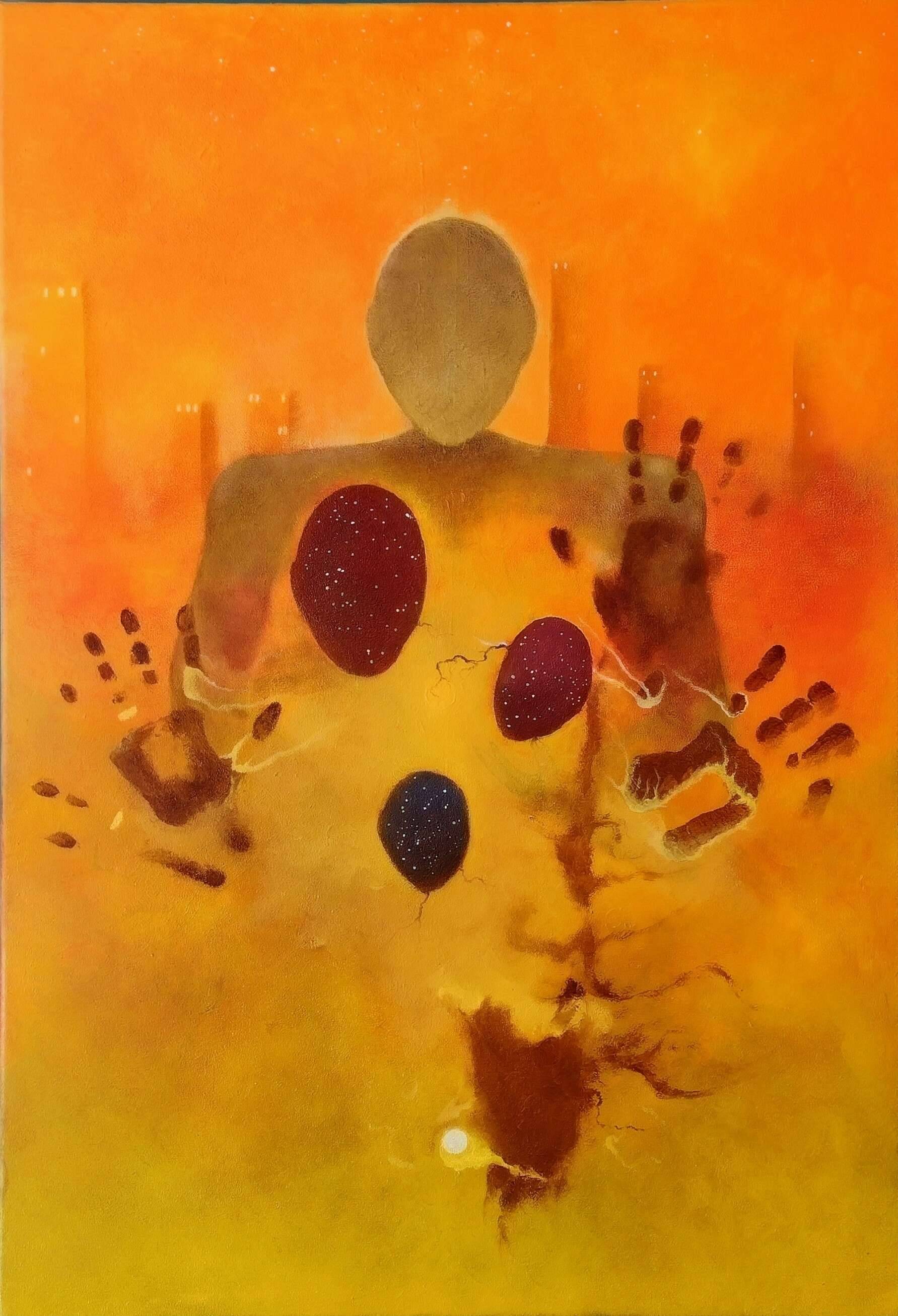 Obraz emanuje ciepłem i tajemniczością dzięki jego pomarańczowo-żółtej kolorystyce, która sprawia, że wszystko wydaje się jakby rozmazane przez intensywną mgłę. Główna postać, pozbawiona twarzy, unosi się centralnie w kadrze, otoczona jest przez kilka ciemnych balonów, które jakby zawieszają się w przestrzeni. Na jej korpusie widać odciski dłoni, które dodają dziełu nuty surrealizmu, jakby ktoś próbował sięgnąć przez niewidzialną barierę. To takie magiczne! Atmosfera jest niemalże eteryczna, zachęcająca do kontemplacji. Widzowie mogą poczuć mieszankę spokoju i niepokoju, jakby w zanurzeniu w czyjeś wspomnienia. Artysta używa techniki impasto, delikatnie nakładając farbę warstwami, co nadaje głębi obrazu. Elementy abstrakcyjne przeplatają się z symboliką. Czy te balony reprezentują marzenia? Warto zauważyć, że choć styl jest nowoczesny, to ma on w sobie coś z klasycznych motywów egzystencjalnych. I nagle myślisz: Wow, co to wszystko znaczy? Ten obraz to prawdziwy mind-bender, bo prowokuje pytania o to, kim jesteśmy i jakie ślady pozostawiamy w świecie.