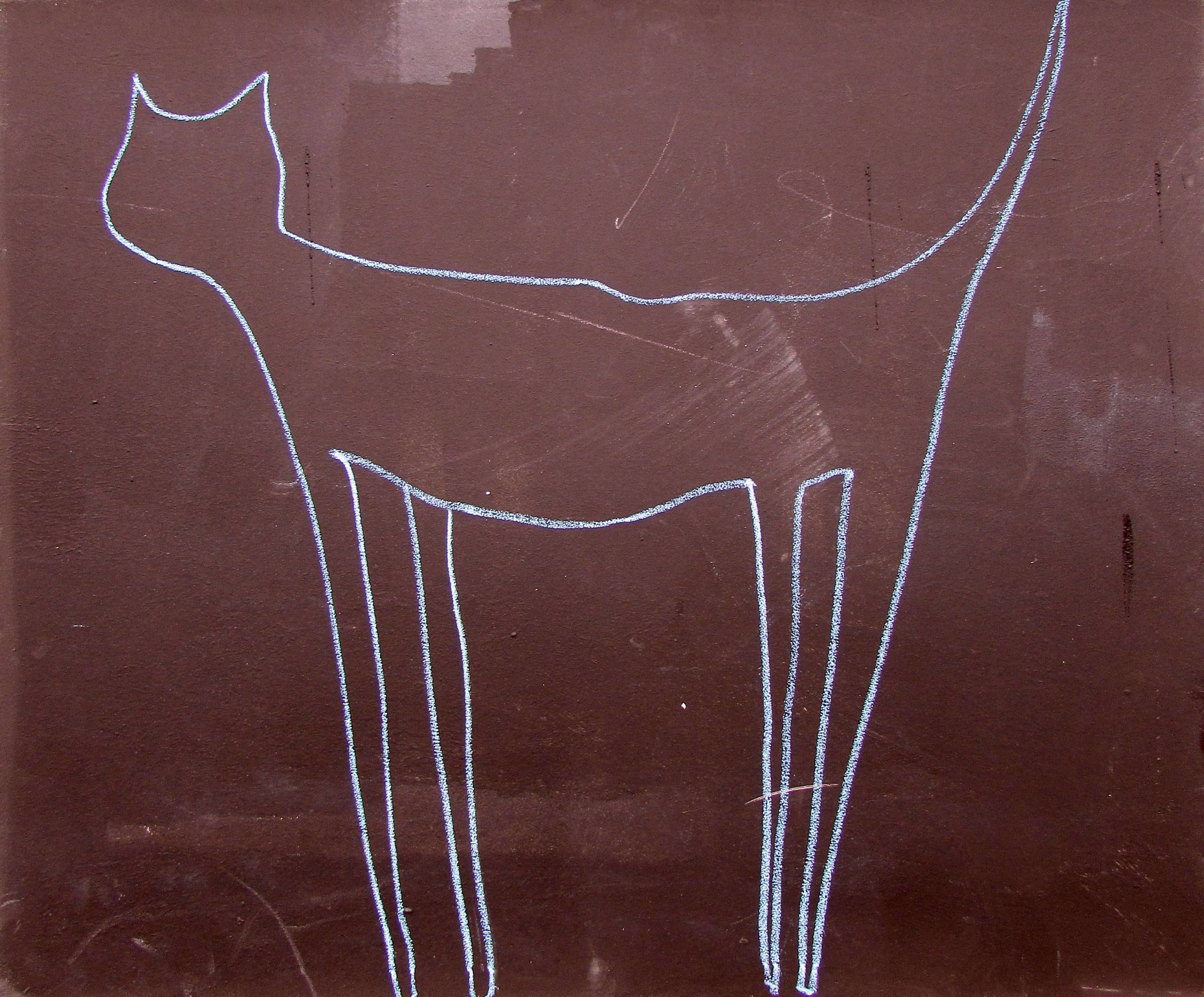 Na obrazie widzimy prosty szkic kota, narysowany kredą na ciemnym tle. Cienka, niebieska linia układa się w kształt kota, którego sylwetka jest wydłużona i geometryczna. Tło ma ciemnobrązowy kolor, co sprawia, że delikatny szkic wybija się i przyciąga wzrok. Atmosfera obrazu jest nostalgiczna, przywodząca na myśl szkolną tablicę pełną dziecięcych rysunków. Ten prosty obraz jest pełen uroku i niewinności. Jest jak radosne wspomnienie z dzieciństwa. Prostota formy i minimalizm techniki dodaje dziełu uroku i świeżości. Można by rzec, że nastrój jest trochę mysterious, niepewny, ale i pełen ciepła. Patrząc na niego, poczułem przypływ beztroskiej radości. Czuję się, jakby wracać do czasów, gdy koty były nie tylko zwierzętami, ale magicznymi towarzyszami dziecięcych zabaw. To przypomnienie, że piękno tkwi często w prostocie, a emocje można oddać bez zbędnych detali. A mały Jaś powiedziałby: "To kotek z kredki. Taki chudy". Dzieło pozostawia przestrzeń na osobistą interpretację i oddech, by doznać artystycznej przygody.