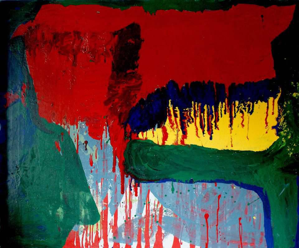 Oto niezwykle barwny obraz, tętniący energią i emocjami. Dominują w nim intensywne czerwienie, z akcentami głębokiej zieleni i kontrastującej żółci. Kompozycja jest wręcz szalona, z plamami koloru, które wyglądają jakby artysta wrzucił farbę na płótno, pozwalając jej swobodnie spływać. To prawdziwy festiwal barw, który przyciąga wzrok swoją nieprzewidywalnością. Obraz ma w sobie coś z chaosu, a jednocześnie wydaje się przemyślany w najdrobniejszym szczególe. Nastrój obrazu jest intensywny, niemal krzykliwy. Można by pomyśleć, że to wizualna reprezentacja burzy emocji. Styl ten przypomina ekspresjonizm abstrakcyjny, gdzie forma jest mniej istotna od samego wyrazu. Artysta zdaje się stosować technikę impastu, nakładając grube warstwy farby, które tworzą ciekawą teksturę. Patrząc na to dzieło, czuje się dynamikę i ruch, jakby kolory były zatrzymane w pół skoku. To przypomina potężną falę energii, która nadchodzi i porusza wewnętrzne struny odbiorcy. Dla mnie ten obraz to prawdziwy "wow moment", coś co nagle eksploduje emocjami. Mogłoby napisać o nim dziecko: "Wow, ale dużo kolorow!". Obraz zachęca do refleksji nad chaosem i porządkiem w świecie, prowokując pytania i może nawet pobudzając do kreatywności. Jakby zapraszał, by poszukiwać w nim własnych historii i ukrytych znaczeń.