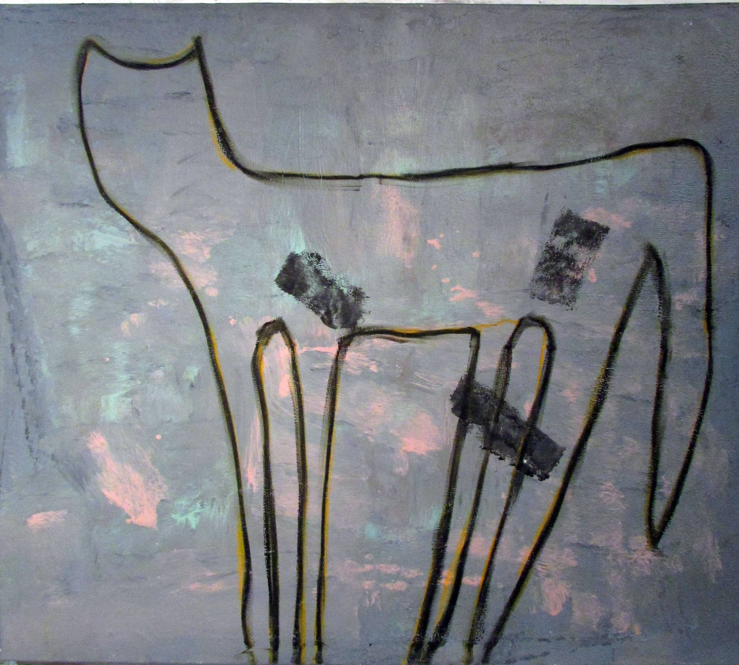 Na obrazie dominują zgaszone, szare tony przełamane rozmytymi plamami różu i fioletu, tworząc tajemniczą i nieco melancholijną atmosferę. Czarny zarys przypomina sylwetkę kota – figlarną i prostą, ale pełną ekspresji. Linie są niedbałe, jakby artysta kreślił je z wariacką pewnością siebie. Całość to coś jak "controlled chaos", gdzie każda kreska ma swoje miejsce. Styl jest abstrakcyjny, z lekkim naciskiem na minimalizm. Elementy te mogą wywoływać mieszankę emocji: od zamyślenia po dziecięcą radość. A mówi się, że mniej znaczy więcej! Technika przypomina spontaniczne nakładanie farby, co dodaje pracy dynamizmu. Hej, mamo, to wygląda jak kotek! Artysta zdaje się igrać z naszymi oczekiwaniami, pozostawiając wiele przestrzeni na własną interpretację. Obraz emanuje spokojem, ale kryje w sobie coś intrygująco nieznanego. Czy to smutek? Może nostalgia. Każdy zobaczy co innego, co w sztuce jest takie fascynujące. Do tego ten szary kolor. Jakaś magia jest w tym wszystkim, nie sądzisz? Najbardziej lubię te niewielkie akcenty różu, które dodają życia całej kompozycji.