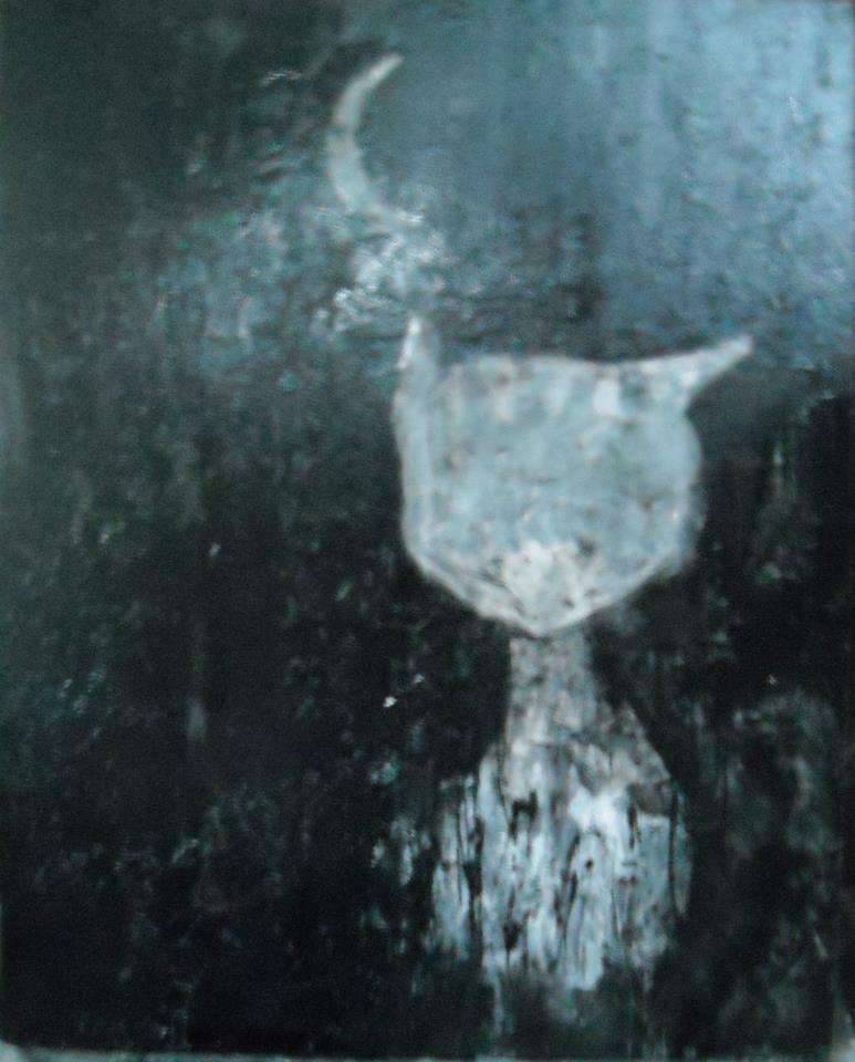 Na obrazie dominuje ciemna, ponura paleta barw. Przeważają czernie i szarości, które otulają tajemniczy, zarysowany kształt. Kompozycja skupia się na centralnej białej formie przypominającej nieco zarys byka. Przebłyski światła wpadające na obraz tworzą niejednorodne, niemal abstrakcyjne niuanse, co dodaje głębi i tajemniczości. Atmosfera dzieła jest nieco posępna i zdystansowana. Widać tu jakąś ukrytą historię, coś, co jest na wyciągnięcie ręki, ale jednak niedostępne. Styl malarski jest zdecydowanie ekspresjonistyczny z akcentem na strukturalność farby. Artysta posłużył się technikami impasto, co tworzy chropowatość i fakturę, która niemal woła do odbiorcy, by ją dotknąć. Użycie ograniczonej gamy kolorów podkreśla skrajne emocje, od niepokoju po refleksyjność. Wygląda jak coś z horroru! Dla wielu ten obraz może wywoływać uczucie izolacji, samotności, ale też fascynacji niewidocznymi szczegółami. Czuć tu lekki "grunge vibe". Jest to dzieło, które się komentuje, a nie tylko ogląda. Kto wie, być może skrywa duchy przeszłości lub symboliczne przesłania.