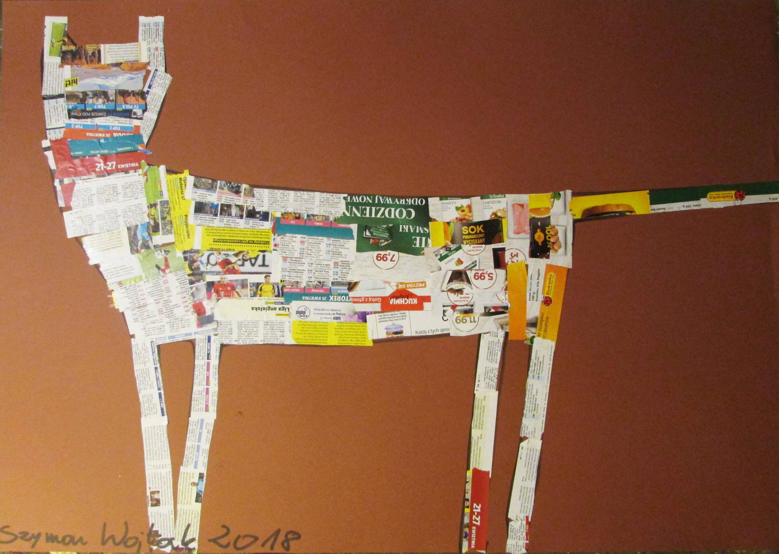 Obraz przedstawia kolaż w formie kota, stworzony z kolorowych wycinków z gazet, które kontrastują z czystym, brązowym tłem. Elementy kolażu są nieregularne, co nadaje dziełu dynamiki i nieprzewidywalności. Dominują odcienie czerwieni, zieleni i żółci, które ożywiają sylwetkę kota i przyciągają wzrok. Koci kształt jest z jednej strony prosty, a z drugiej bogaty w detale, dzięki różnorodności tekstur i wzorów wycinków. Atmosfera obrazu jest swobodna i nieco zabawna. Dzieło emanuje pewną nonszalancją i artystycznym luzem, sprawiając, że na twarzy oglądającego pojawia się uśmiech. Technika kolażu podkreśla kreatywność autora i jego umiejętność łączenia różnych elementów w harmonijną całość. Oglądając ten obraz, można poczuć nostalgię za dzieciństwem, kiedy wszystko wydawało się być made of magic. A jak pomyślisz o tym dłużej, może to tylko przypadkowe wycinki, ale razem stają się czymś wyjątkowym. Wow, taki kot z gazet! To zdanie mogłoby napisać dziecko, które odkrywa ten świat. Obraz prowokuje do refleksji nad tym, jak zwykłe, codzienne przedmioty mogą zyskać zupełnie nowe znaczenie dzięki odrobinie wyobraźni.