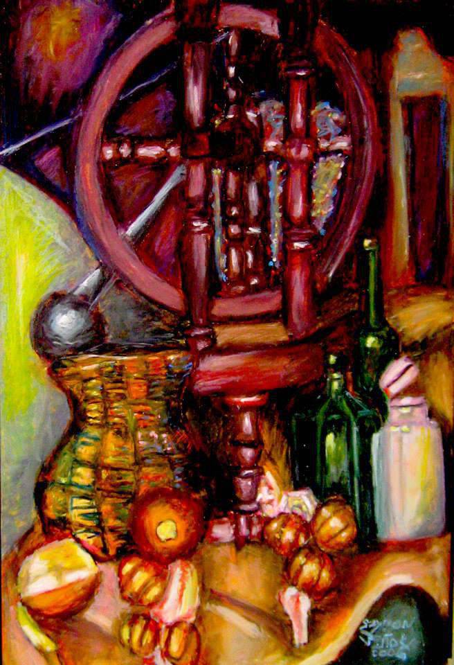 Ten obraz to prawdziwa eksplozja kolorów i form. Dominują ciepłe odcienie brązu, czerwieni i złota, które przeplatają się z chłodnymi zieleniami butelek. Centralnym punktem jest kołowrotek, symbol dawnej pracy ręcznej, otoczony różnymi przedmiotami, jak butelki i owoce. Kompozycja jest żywa i pełna dynamiki, niczym scena z życia codziennego, która emanuje przytulną, nostalgiczną atmosferą. Można poczuć zapach wspomnień. Artystyczna technika to mix impasto i miękkich przejść kolorystycznych, które tworzą trójwymiarowy efekt. Artysta bawi się teksturą, nie bojąc się odważnych pociągnięć pędzla. Obraz może budzić różnorakie emocje – ciepło, tęsknotę za prostotą, a nawet melancholię. Niektóre kolory 'shine' jakby sam światło pochodziło z wewnątrz przedmiotów. Dla mnie ten obraz przypomina rodzinne opowieści. Wyzwala wspomnienia wieczorów spędzonych z babcią przy herbacie. Nastrojowy, prawda? Patrząc na niego, czuję, że każdy element składa się na opowieść o przemijaniu czasu i utrzymywaniu tradycji. Podoba mi się jak koło kręci się jak w bajce! Idealny przykład sztuki, która mówi własnym językiem, pełnym subtelności i mocy.