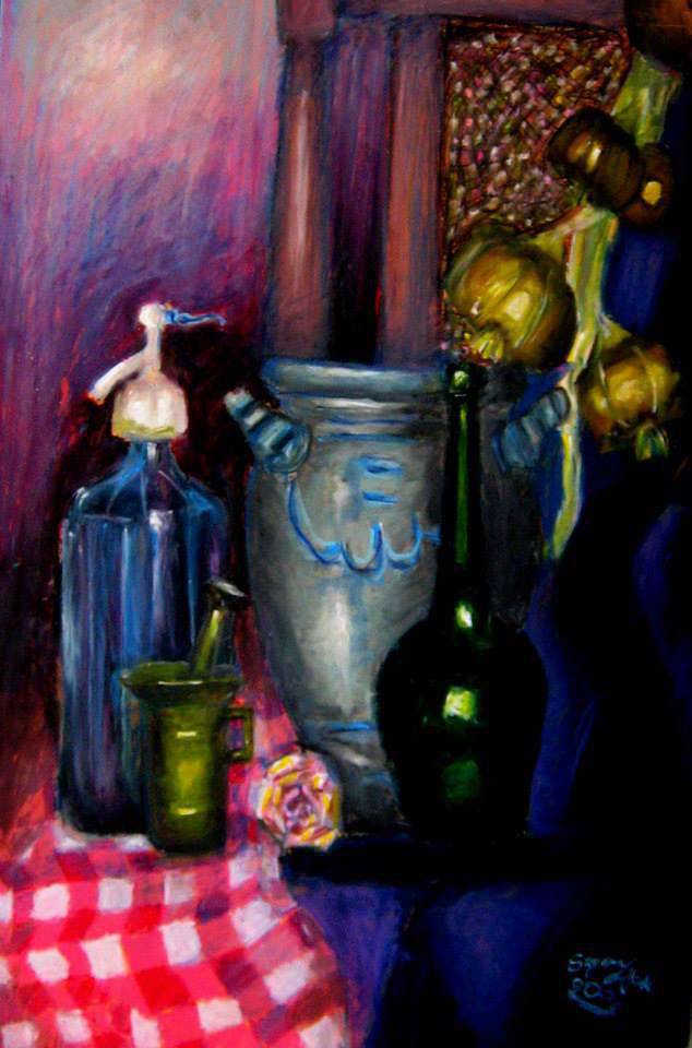 Na tym obrazie widzimy bogatą gamę kolorów, z dominującymi ciepłymi odcieniami czerwieni, fioletu i złota. Kompozycja jest starannie przemyślana, z centralnie umieszczonymi przedmiotami codziennego użytku – butelką z pompką, zieloną butelką i metalowym naczyniem. Przestrzeń wypełnia też kosz produktów, tworząc klimatyczny i trochę nostalgiczny nastrój. Technika artystyczna? Zdecydowanie postawiono tutaj na wyraziste pociągnięcia pędzla, które dodają energii i dynamizmu. Coś w stylu: feel the vibe, jakby artysta chciał przekazać ulotność chwili. Obraz emanuje ciepłem i przytulnością, przypominając o domowych zakątkach pełnych życia i historii. Może wywoływać różne emocje, od spokoju po ciekawość. Taki obrazek, na który popatrzysz i masz ochotę zanurzyć się we własnych wspomnieniach. No i te piękne kolory, które sprawiają, że czujesz się jak w bajce. Dla mnie, to trochę jak uchwycenie chwili, której nie chcesz zapomnieć. Kiedy patrzę na ten obraz, czuję, jakby czas stanął na moment. Każdy szczegół kryje w sobie opowieść, która czeka, żeby ją odkryć.