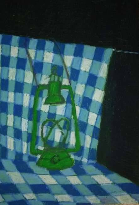 Obraz przedstawia zieloną lampę naftową na tle wyrazistej kraciastej tkaniny w odcieniach niebieskiego i bieli. Te kontrastujące kolory tworzą harmonijną, lecz dynamiczną kompozycję, która przyciąga wzrok. Przestrzeń wypełniona ciemnym tłem dodaje elementu tajemniczości, jakby lampa miała zaraz ożywić swym blaskiem całą scenę. Artysta zastosował technikę grubych pociągnięć pędzla, nadając obrazowi teksturę i głębię, co dodaje dziełu charakteru. Nastrój? Troszkę nostalgiczny, jakbyśmy wracali do wspomnień z dzieciństwa przy babcinym stole. "The feeling of home," można by powiedzieć, choć z nutką zadumy. Czy ta lampa kiedyś rozświetlała długie zimowe wieczory? Może kiedyś w niej była duch opowieści? Ogólnie, obraz skłania do refleksji nad prostotą i pięknem codziennych przedmiotów uchwyconych w nietypowej formie. To jest lampa, która wygląda jak kosmita! Ciepło i spokojne uczucie, jakie budzi, pozostaje z odbiorcą na długo. Spoglądając na to dzieło, ciężko nie zatrzymać się na chwilę, by docenić te drobne chwile codzienności, których często nie dostrzegamy.