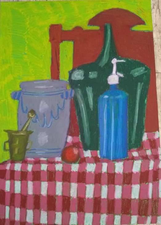Obraz kipi kolorami i żywymi kształtami. Patrząc na to dzieło, od razu rzuca się w oczy intensywna zieleń tła oraz kontrastujący z nią czerwony i biały obrus w kratę. Na pierwszym planie widać kolejne przedmioty, jak niebieska butelka z pompką, która zdaje się dominować nad pozostałymi elementami. Obok niej ciemnozielony dzban oraz szary garnuszek z mosiężnym tłuczkiem. Całość ma w sobie coś rustykalnego, a może nawet nieco nostalgicznego. Kompozycja obrazu jest przemyślana, każda rzecz wydaje się mieć swoje właściwe miejsce. Nastrój obrazu jest spokojny, ale zarazem nieco tajemniczy. Czy to wspomnienie z wiejskiej kuchni, czy może próba uchwycenia chwil ulotnych i cennych? Styl artysty łączy w sobie cechy impresjonizmu z nutą współczesnego twistu. Kolory są nasycone, niemalże namacalne. Można poczuć się, jakbyśmy byli w środku tego świata, gdzie kolory grają pierwsze skrzypce. Emocje, które obraz wywołuje, to mieszanka spokoju i ciekawości. Jakby zapraszał nas do zastanowienia się nad tym, co przedstawiają przedmioty, jakie historie opowiadają. Gdzieś w środku tej kompozycji można odnaleźć spokój. Zielony to często kojarzony z "calmness". Nigdy nie widziałem czegoś takiego! Obraz zdaje się mówić – zatrzymaj się, spójrz, poczuj. Coś dla serca i duszy.