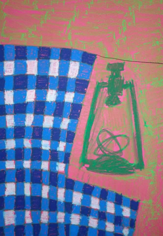 Na obrazie widać żywą kombinację kolorów: intensywny róż przeplata się z odcieniami zieleni. Po lewej stronie dominuje niebiesko-biała szachownica, która wygląda jak kraciasty koc w letni dzień. Po prawej mieści się szkicowy kontur butelki wykonany zieloną barwą, dodający elementu tajemniczości. Artysta użył pastelowych technik, które nadają całości miękkiego, lekko rozmytego wyrazu. Czy te kolory tańczą razem, czy walczą o uwagę? Trochę jedno i drugie! Atmosfera sugeruje beztroski letni dzień, gdzie czas płynie wolniej, ale jest pełen energii. Styl jest swobodny, niemal dziecięcy, co sprawia, że obraz emanuje radością i niewinnością. Przypomina mi, jak razem z przyjaciółmi bawiłem się na łące. Dla siedmiolatka obraz mógłby przedstawiać "podłogę z fantastycznym dywanem i magiczną butelką". Element zaskoczenia dodaje dynamizmu i sprawia, że zatrzymujemy się na chwilę, by kontemplować. It's a playful reminder of the importance of enjoying the little things in life.