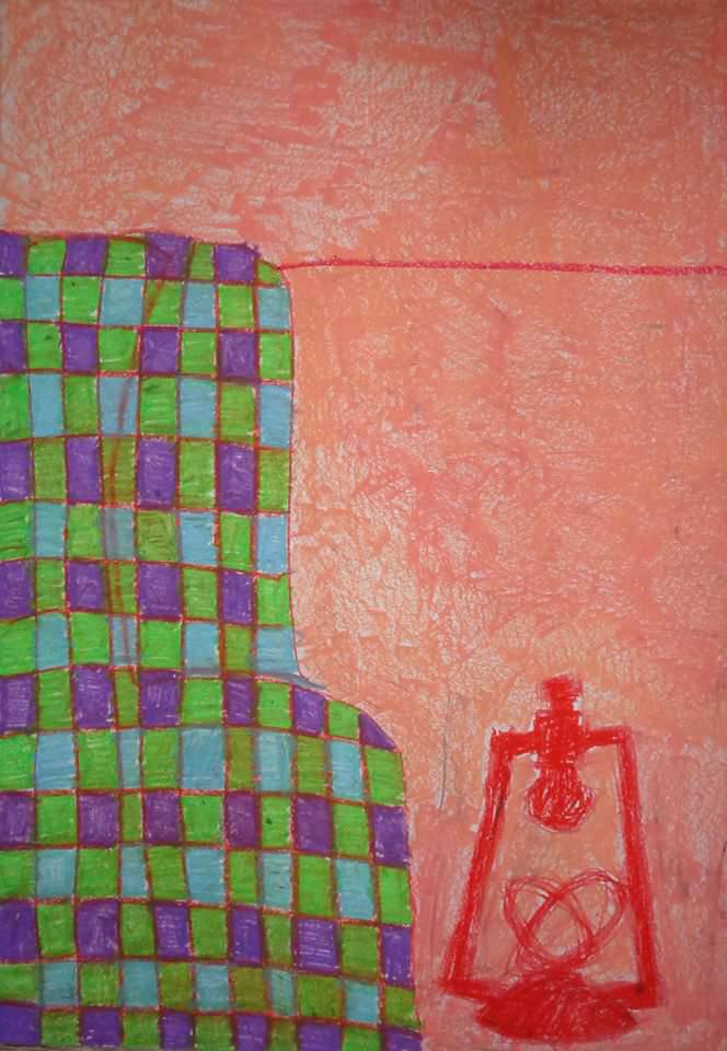 Obraz przyciąga wzrok intensywnymi kolorami i geometrycznymi kształtami. Lewa strona zdominowana jest przez szachownicę w odcieniach zieleni, fioletu i błękitu. Te prostokąty układają się w pewną rytmiczną harmonię, wprowadzając do kompozycji ruch i energię. Tło zaś to delikatny, różawy odcień, który nadaje miękkości i spokoju. Nachodząca z boku linia czerwona wprowadza pewien element "surprise", który zmienia sposób, w jaki postrzegamy całość. Nastrój obrazu jest jednocześnie spokojny jak i radosny. Niektóre kształty przypominają dziecięce rysunki, co dodaje obrazowi niewinności. Linia czerwona z prawej strony rysuje kształt przypominający twarz, jakby obraz opowiadał własną historię w abstrakcyjny sposób. Prace takiego typu potrafią skłonić do refleksji nad prostotą i pięknem codziennych rzeczy. Styl artystyczny to swoista mieszanka abstrakcji i naiwności, jakby autor bawił się formą i kolorem, nie dbając o sztywne ramy. Ta swoboda artystyczna z pewnością przyciągnie uwagę zarówno dorosłych, jak i dzieci. "To wygląda jak śmieszna twarz!", powiedziałoby dziecko, dostrzegając kształty na różowym tle. Obraz ten to idealny przykład, jak proste formy potrafią być pełne emocji i głębi. Patrząc na to dzieło, czuję, jak wypełnia mnie nostalgia za beztroskimi czasami dzieciństwa.