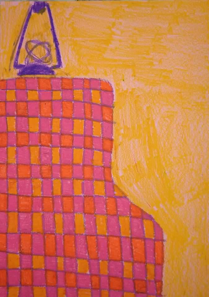 Barwna eksplozja żółci, pomarańczy i różu tworzy obraz pełen energii i dynamiki. W centrum widnieje wzór przypominający miękką tkaninę złożoną z różowych i pomarańczowych kwadratów, które układają się w geometryczną mozaikę. To jak patchwork – każdy kwadrat osobno, a jednak razem tworzą harmonię. W górnej części obrazu, niebieski trójkąt z subtelnym symbolem dodaje tajemnicy, jakby przyciągał wzrok ku czemuś nieznanemu. Na pierwszy rzut oka, kompozycja wydaje się chaotyczna, ale przy bliższym spojrzeniu ujawnia wrodzony rytm, niczym kalejdoskop. Obraz emanuje ciepłem i pogodnym nastrojem. Płaskie powierzchnie i ostre krawędzie przywodzą na myśl styl op-art, gdzie prostota formy jest kluczem do zrozumienia głębszej intencji artysty. Pastelowe kolory, choć jaskrawe, tworzą harmonijną całość, porządkującą zmysły. Mogą przypominać letni zachód słońca nad miastem, subtelnie zapraszając do refleksji nad codziennymi radościami. Patrząc na ten obraz, można poczuć „joy” jak małe dziecko bawiące się kolorami kredki. Dla mnie to jak podróż do świata dziecięcej wyobraźni, gdzie wszystko jest możliwe i nic nie musi mieć konkretnego kształtu czy nazwy. Odbiorca może poczuć spokój lub wręcz przeciwnie – ekscytację przed nieznanym. Wszystko zależy od punktu widzenia. W końcu, kto powiedział, że trzeba wszystko rozumieć?