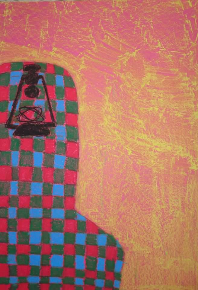 Obraz emanuje intensywnymi barwami, które od razu przykuwają wzrok. Na tle ciepłych odcieni żółci i różu wyłania się postać złożona z szachownicy w kolorach czerwonym, zielonym i niebieskim. Przypomina to trochę patchworkowy koc. W środku tego wzoru, jakby delikatnie wtopiony, znajduje się czarny zarys lampy naftowej. Atmosfera obrazu jest zaskakująco domowa, ciepła i swojska, choć równocześnie lekko surrealistyczna. Styl artysty przywodzi na myśl nowoczesny nurt abstrakcji z wyraźnymi geometrycznymi kształtami i kontrastującymi kolorami. To "wow"! Patrząc na tę kompozycję, można odczuć zarówno spokój, jak i zachęcenie do refleksji nad wewnętrznym światłem i tożsamością. Mam wrażenie, że ten obraz przemawia do mojego wnętrza. Czy to nostalgia za dzieciństwem, czy może poszukiwanie własnego ja? A może to tylko ja tak to odbieram? Technika malarska wydaje się swobodna, niemal dziecięca, ale jednocześnie precyzyjna. Wywołuje to we mnie poczucie harmonii, ale też pewnego rodzaju tajemnicy. Jakby obraz chciał powiedzieć: "Baw się, szukaj, odkrywaj!"