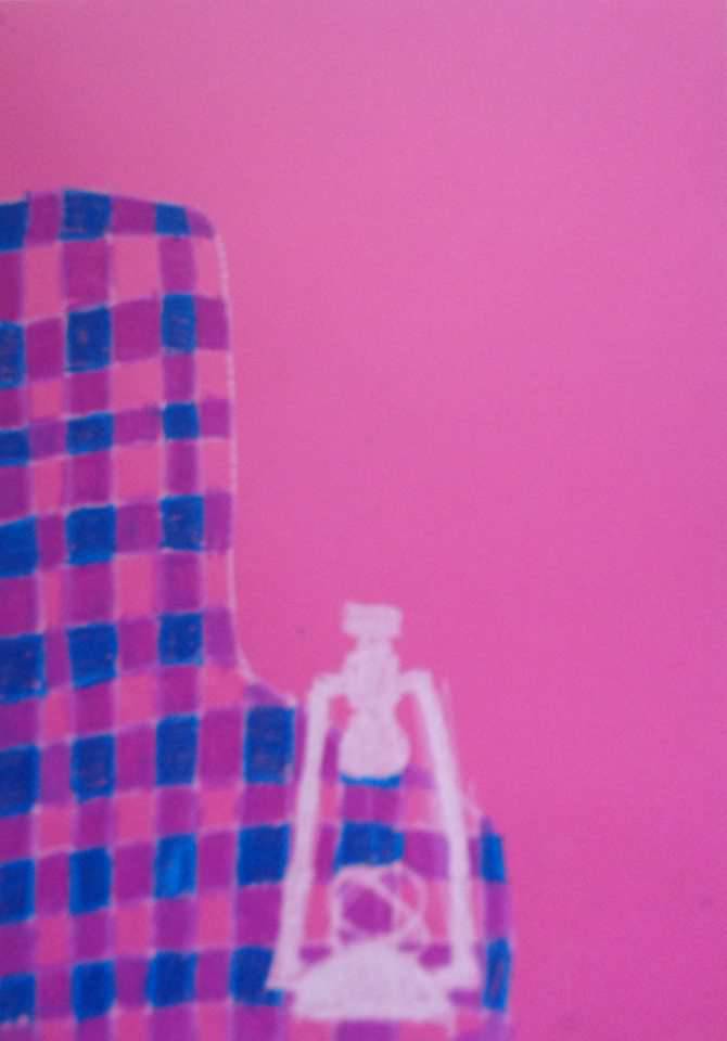 Obraz oddaje niesamowitą prostotę z nutą abstrakcji. Główna część kompozycji to różowa powierzchnia, która emanuje delikatnym, ciepłym nastrojem. Na pierwszy plan wysuwa się kratkowany wzór w odcieniach niebieskiego i różowego, przypominający dziecięcą zabawę kolorami. Wydaje mi się, że artysta stosuje technikę kontrastu barw, by przykuć uwagę i nadać obrazowi "wow effect". Lampa/zabawka (?) na tle kraty wprowadza pewien dysonans, który intryguje. Wywołuje to uczucie nostalgii za dzieciństwem, kiedy wszystko wydawało się bardziej kolorowe i radosne. Może to właśnie miało być celem artysty – przywołanie wspomnień i powrót do czasów, gdy wszystko było prostsze. Kolory przywodzą na myśl baloniki unoszące się w wesołym miasteczku. Mój osobisty odbiór to mieszanka radości i spokoju. Patrząc na ten obraz, czuję się jak dziecko marzące o lodach. Ta różowa przestrzeń jest jakby tłem dla opowieści pełnej fantazji. I think this artwork invites the viewer to dream. Taki prosty, a zarazem tak głęboki.