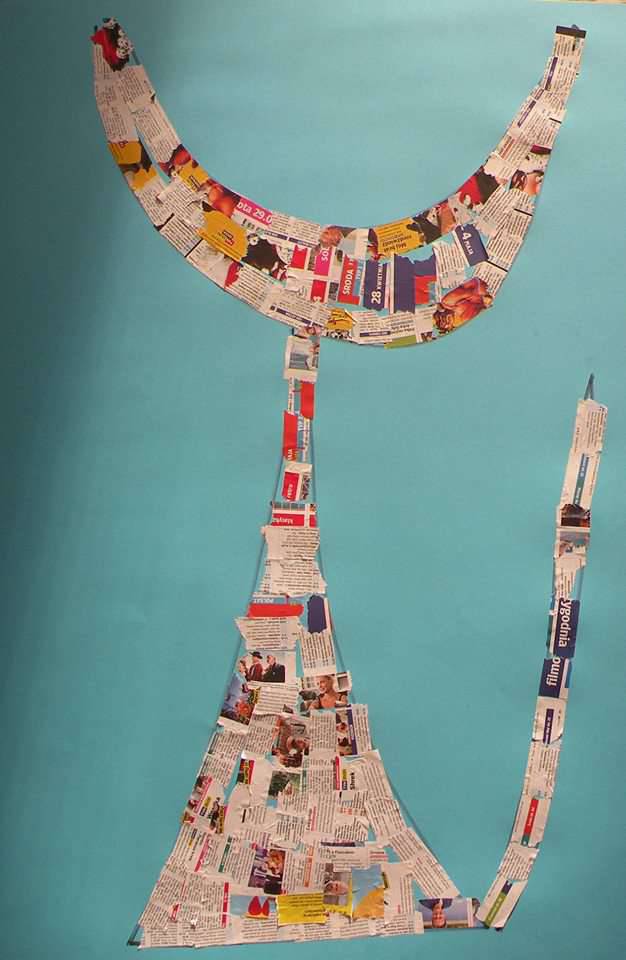 Na niebieskim tle widzimy niezwykły kolaż przedstawiający sylwetkę kota. Kot jest złożony z wycinków z gazet, które tworzą kształt z podniesionym ogonem i elegancką łukowatą szyją. Kolory gazet – czerwone, niebieskie, żółte – nadają pracy lekko chaotyczny, ale zarazem harmonijny wygląd. Całość emanuje lekkim humorem i swobodą. Technika kolażu pozwala na intrygującą teksturę, przyciągając wzrok odbiorcy. Artysta sprytnie wykorzystał różnorodność kolorów i kształtów, by dodać dynamiki. Patrzę na to i myślę, jak ten kot wprowadza przyjemną nonszalancję w nasze życia. Pewnie z daleka też by się uśmiechał. To dzieło wzbudza skojarzenia ze spontanicznością i kreatywnością dziecięcej radości. "Ten kot wygląda jak papierowa magia!" powiedziało dziecko i faktycznie ma rację. Elementy wycinków sprawiają, że obraz nie jest tylko kompozycją kolorowych papierków, ale prawdziwą "collage". Złożoność prostoty, nie sądzisz? To kot, który „mówi” na tysiące sposobów.