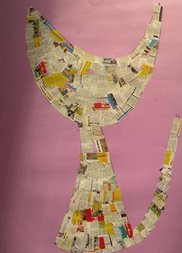 Obraz przedstawia uroczy kolaż w kształcie kota, wykonany z pociętych kawałków gazet. Kolory są zdominowane przez stonowane beże i szarości, przełamane jasnymi akcentami czerwieni i niebieskiego. Tło fioletowe, co dodaje ciepła i tworzy przyjemny kontrast z chłodnymi barwami gazety. Kształt kota jest uproszczony, niemal geometryczny, jednak dzięki temu pełen wdzięku. Atmosfera obrazu emanuje lekkim humorem i nostalgią. Przypomina mi dni spędzone na dziecięcych zabawach w tworzenie kolaży z mamą. Artysta używa techniki kolażu, nakładając warstwy papieru, co daje teksturę i interesujący efekt wizualny — to prawdziwe "paper magic". Kot wydaje się spokojny i zrelaksowany, może nawet tajemniczy. Jedno jest pewne, każdy kto spojrzy na ten obraz, poczuje uśmiech rosnący na twarzy. Czy to nie ciekawe, że małe kawałki gazety mogą stworzyć coś tak pięknego? Gdybyż każdy kot był tak łatwy do poskładania jak puzzle! Obraz może skłaniać do refleksji nad tym, jak z chaosu można wydobyć piękno.