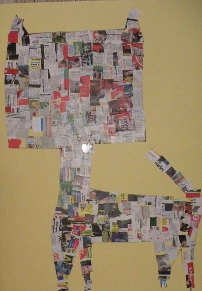 Na obrazie widzimy zaskakujące dzieło w formie kolażu. Użyte zostały kolorowe wycinki z gazet, które tworzą duże, geometryczne formy przypominające zwierzęta. Dominują prostokątne kształty zagubione w chaosie papierowych skrawków. Kolory to miszmasz czerwieni, czerni, żółci, splątane z tekstem i fotografiami z gazet. Kompozycja jest intrygująca, balansuje na granicy abstrakcji, a jednocześnie wywołuje odczucie swojskości i radości. Obraz przypomina dziecięcą zabawę - coś, co mógłby stworzyć 7-letni artysta w zaciszu swojego pokoju: "To jest kotek i piesek z gazet". Styl artystyczny? To kolaż w czystej formie. Technika wydaje się swobodna, niczym zabawa formą bez ograniczeń. U odbiorcy pojawia się poczucie nostalgii oraz refleksja nad prostotą dziecięcej wyobraźni. Może to wygląda nieporadnie, ale w tym tkwi magiczne "freedom", co prowadzi nas do odkrywania ukrytych znaczeń. Obraz emanuje ciepłem, radosnym chaosem, który przyciąga i zaprasza do bliższego kontaktu z jego dziecięcym światem.