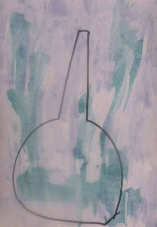 Na obrazie widzimy delikatną kompozycję złożoną z abstrakcyjnych kształtów, przypominających kontury wazonu, narysowane cienką, czarną linią. Tło jest pastelowe, z przewagą bladego błękitu i subtelnymi akcentami zieleni, które nadają całości lekko eteryczny charakter. Barwy przenikają się płynnie, tworząc efekt akwarelowych plam, co sprawia, że wszystko wygląda jakby unosiło się w powietrzu. Obraz emanuje spokojem, prawie jak senne marzenie. Styl artystyczny przypomina trochę niedbałe pociągnięcia pędzla, jest bardzo loose, jakby artysta poszedł za impulsem. Technika mieszania farb sugeruje pewną niedoskonałość, ale też cudowną spontaniczność. Dzieło skłania do refleksji, trochę zaskakuje prostotą. Ktoś mógłby powiedzieć, że wygląda to jak coś, co mógłby stworzyć siedmioletni artysta. Refleksja nad obrazem wywołuje uczucie nostalgii. Można poczuć się trochę jak w dzieciństwie, kiedy wszystko wydaje się nieogarnięte, ale pełne potencjału. To obraz, który nie przytłacza, ale daje chwilę wytchnienia od chaosu rzeczywistości.