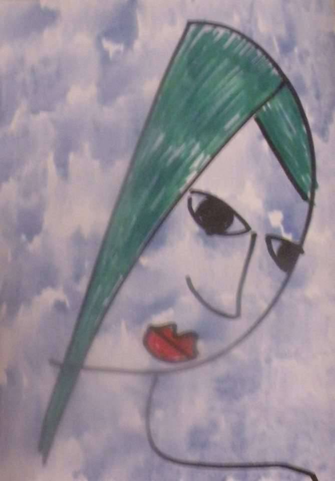 Na obrazie mamy do czynienia z niezwykle interesującym portretem, gdzie dominują subtelne błękity w tle, kontrastujące z soczystymi zieleniami i czerwienią. Twarz stylistycznie zarysowana cienkimi liniami, przypominając trochę doodle rysunki, które mogą się kojarzyć z dziecięcą radością tworzenia. Włosy postaci mają głęboki zielony odcień, a usta są jaskrawo czerwone, co dodaje energii i kontrapunktuje delikatny wyraz twarzy. Atmosfera obrazu jest nieco tajemnicza i melancholijna. Artysta posługuje się techniką przypominającą watercolor, budując warstwami różnorodne odcienie i tekstury. Każdy z tych elementów może wywołać w odbiorcy różne emocje. Można poczuć pewną nostalgię za czymś nieuchwytnym, an elusive feeling, które trudno opisać. Jest tu coś z abstrakcji, co sprawia, że oglądający zastanawia się nad stanem emocjonalnym przedstawionej osoby. Może to być portret kogoś zagubionego we własnych myślach, co budzi we mnie refleksję nad kruchością ludzkiej natury. Mój brat powiedziałby, że to wygląda jak kosmitka z bajki o kosmosie. Ten lekki, a jednocześnie głęboki obraz to prawdziwa uczta dla zmysłów, pozwala odbiorcy na chwilę zatrzymać się i poddać refleksji nad własnym stanem ducha.