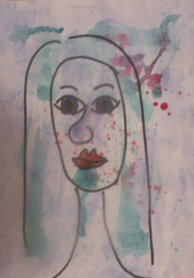 Na obrazie widzimy portret twarzy namalowany w stylu przypominającym kubizm, gdzie proste linie mieszają się z bardziej miękkimi, rozmytymi plamami kolorów. Dominują odcienie niebieskiego i fioletowego, z akcentami czerwieni, które wyglądają jak przypadkowo rozpryski farby na płótnie. Twarz wydaje się spokojna, ale jest coś hipnotyzującego w jej dużych, ciemnych oczach. Może to być pytanie bez odpowiedzi, tajemnica czekająca na rozwikłanie. Atmosfera obrazu jest dość osobliwa, jakby czas zwolnił i rzeczywistość zniknęła w mglistych marzeniach. Technika to mix akwareli i tuszu, co nadaje dziełu delikatność i jednocześnie moc. Twarz jest jedynie zarysowana cienką, czarną kreską, co kontrastuje z żywymi plamami koloru i dodaje dynamiki. Patrząc na ten obraz, widz może poczuć mieszankę nostalgii i ciekawości. Może nawet lekki niepokój związany z tym, co skrywa się za tym spojrzeniem. Dzieło wywołuje emocje odrobinę podobne do dreamlandu, w którym każdy czuje coś innego. Wow, ta pani ma naprawdę duże oczy! Artysta zdaje się mówić do odbiorcy: zatrzymaj się, pomyśl, spójrz głębiej. Ten obraz jest jak okno do innego świata, gdzie zasady percepcji są nieco inne. Mystery spot. I to jest właśnie jego siła i piękno. Każdy odkryje w nim coś nowego.