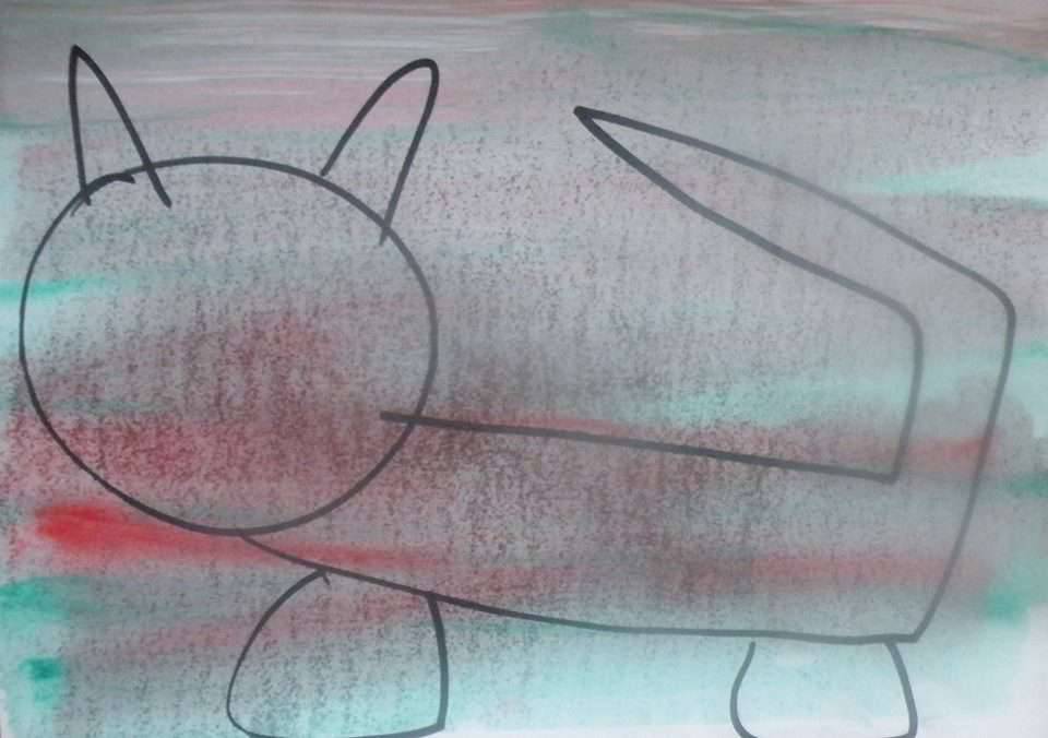 Obraz przedstawia uroczy szkic kota, który wygląda jakby wyszedł spod ręki dziecka. To prosta, czarna linia tworzy kontur zwierzaka na pastelowym tle, które mieni się odcieniami rozmytej zieleni i różu. Kolory te nadają obrazowi delikatną, nieco marzycielską atmosferę. Kot wydaje się być radosny i figlarny, a jego fantazyjne uszy i ogon przyciągają wzrok. Styl artystyczny jest minimalistyczny. Artysta korzysta z techniki, która przywodzi na myśl dziecięce rysunki - jest w tym coś bezpretensjonalnego i urzekającego. Obraz może budzić w widzach wspomnienia z dzieciństwa, przypominając o czasach beztroski i prostoty, kiedy to wystarczyły kartka i kredki, żeby stworzyć "masterpiece". Patrząc na rysunek, robi mi się ciepło na sercu. Przypomina mi to własne rysunki z dzieciństwa. Kot wygląda, jakby chciał wyskoczyć z obrazu i bawić się z widzem. Jest w tym coś wyjątkowo szczerego, autentycznego. Może nie jest to dzieło sztuki w klasycznym rozumieniu, ale na pewno ma swój urok i osobisty czar. Ten obraz to prawdziwa uczta dla wyobraźni.