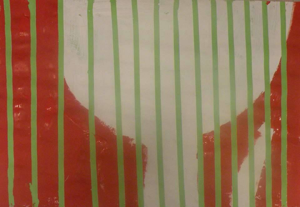 Na obrazie dominują czerwone i zielone pionowe pasy, które nadają mu geometryczną kompozycję. Tło jest jasne, niemal białe, co sprawia, że intensywne barwy pasów wyróżniają się jeszcze bardziej. Czerwone pola są nieregularne, jakby artysta bawił się formą, łącząc precyzję z przypadkowością. Zielone linie mają równomierną szerokość, tworząc kontrast ze swobodnie naniesionymi czerwonawymi plamami. Obraz emanuje dynamiczną energią, angażując wzrok w grę struktur i kolorów. Styl przypomina abstrakcyjne eksperymenty, gdzie technika malowania nie była jedynie narzędziem, lecz sposobem wyrażenia emocji. Takie zestawienie kolorów i form może budzić różne skojarzenia, od harmonii po chaos. Kiedy patrzę na ten obraz, czuje ekscytację, jakbym oglądał zabawę światła i cienia. To jakby puzzle dla oczu, do układania w nieskończoność. Może to przypominać dziecko, które układa klocki na podłodze – pełne radości i spontaniczności. Jest tu coś playful, co przyciąga nie tylko wzrok, ale też wyobraźnię. Obraz z pewnością pozostawia przestrzeń do interpretacji, pozwalając każdemu znaleźć coś innego w tej kolorystycznej mozaice.