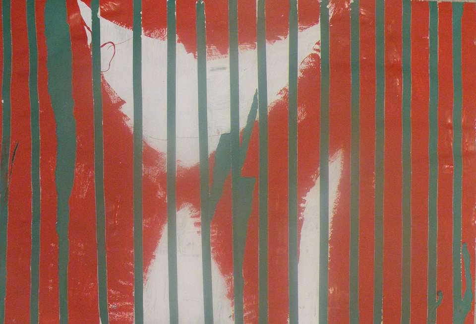 Obraz ten to prawdziwa eksplozja kolorów i form. Dominuje intensywna czerwień tła, przecinana zielonymi pionowymi liniami, które jakby tworzyły rytmiczny, nieco hipnotyzujący pattern. Te zielone paski mogą przypominać mi bars – takie słowo po angielsku pasuje idealnie tutaj! W centrum dostrzec można białe kształty, które sprawiają wrażenie ruchu, jakby coś chciało się wydostać, przebić przez te "kraty". Atmosfera obraz jest pełna napięcia, jakby coś wielkiego miało się wydarzyć. Artysta używa prostych, ale odważnych pociągnięć pędzla, co dodaje modernistycznego vibe'u. Obraz wywołuje mieszane emocje: z jednej strony czujesz frustrację, a z drugiej nadzieję, że zaraz odkryjesz coś niezwykłego. Niektórzy mogą interpretować te formy jako próbę ucieczki lub wolności, która staje się tu bardzo wyrazista. Dla mnie to jak tajemnica, którą chcesz rozwiązać – a dzieciak pewnie powie: "To wygląda jak dinozaur w paskach!". Ach, jak wizualna zagadka potrafi wciągnąć! Obraz prowokuje do chwilowego zatrzymania, zastanowienia się nad barierami – tymi wewnętrznymi i zewnętrznymi. To taki moment, gdzie nie musisz mieć wszystkich odpowiedzi, a samo pytanie staje się journey.