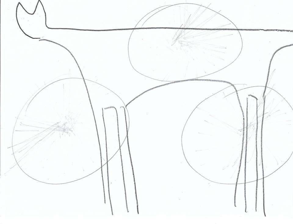 Na obrazie widzimy prostą, wręcz minimalistyczną kompozycję, gdzie dominują delikatne linie tworzące kontury postaci przypominającej rower z kocim ogonem. Kolory? A właściwie ich brak – rysunek jest surowy, wykonany cienką czarną kreską na białym tle. Dwa duże okręgi sugerujące koła wydają się niemalże unoszące w powietrzu, a prostota formy przywodzi na myśl dziecięce rysunki, które potrafią wzbudzić uśmiech i nostalgię. Atmosfera dzieła jest pogodna, jakby chciało się powiedzieć – beztroska. Artystyczny styl to swoisty mix dziecięcej naiwności i abstrakcyjnej sztuki, gdzie kreski biegną nierównomiernie, a mimo to przekazują coś więcej niż standardowe proporcje. Widz może poczuć się zaskakująco zaintrygowany prostotą i humorem, który wydaje się płynąć z tego obrazka. Wywołuje emocje, a może i wspomnienia z czasów, gdy samemu rysowało się na marginesach zeszytów – a może to jest właśnie intencja artysty? Dzieciak powiedziałby: "To jest rower-kot, bo ma uszy i kółka do jazdy". Ten uroczy, lekko surrealistyczny obrazek wywołuje ciepłe uczucia, przypominając o potędze wyobraźni. A jeśli o technice mowa, to simplicity to klucz do serc widzów. Rozmieszczenie elementów i swoboda linii podkreślają brak skomplikowania, każą zatrzymać się na chwilę, docenić dziecięcą radość w czystej formie.