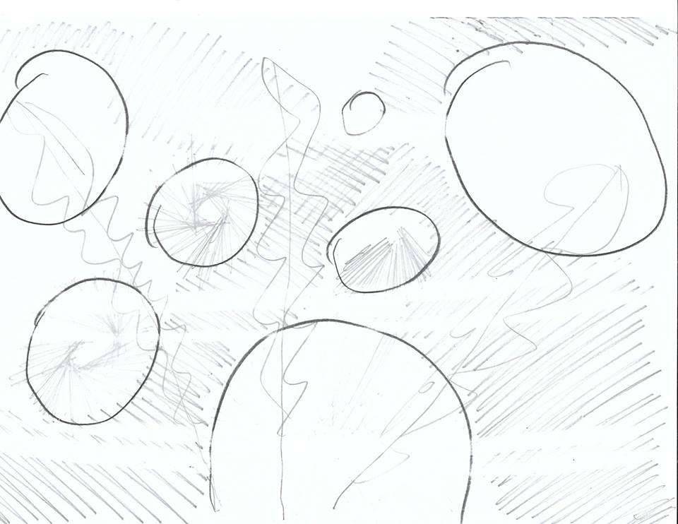 Na białym tle obrazu wirują okręgi, rysują się łagodnie rozrzedzone linie. Sześć kształtów, różnorodnych rozmiarów, gładko i płynąco unoszących się na powierzchni. W powietrzu można niemal poczuć ruch, jakby z każdej strony napływała energia. Jest coś hipnotyzującego w tej swobodnej kompozycji, przypomina mi puszczanie baniek mydlanych w letni dzień. Tak jakby artysta bawił się linią, eksperymentując z różnymi teksturami. Wprowadza delikatność i chaos, ale w „delikatnym” stylu. Jak się patrzy to przypomina sky pełen unoszących się balonów. Ta praca działa jak magnes, przyciąga wzrok i wywołuje uśmiech, mimo że jest tak prosta. Czuję jakbym mógł na nią patrzeć godzinami. Dziecko może powiedzieć: „Te kółka latają jak moje marzenia!”. Ten obraz jest jak cisza przed burzą – spokój przed eksplozją czegoś wyjątkowego. Co za frajda, naprawdę! Jednocześnie emanuje spokojem, a w tle słychać cichy szept wyobraźni. Fascynuje mnie, jak coś tak prostego może być jednocześnie tak bogate w emocje.