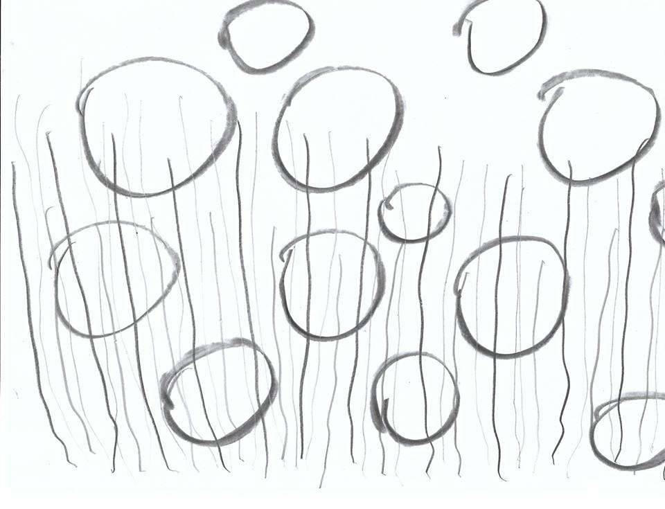 Na obrazie widzimy grupę czarnych okręgów o różnej wielkości, rozmieszczonych na białym tle. Pomiędzy nimi wiją się cienkie pionowe linie, przypominające trawę lub deszcz. Rysunek jest prosty, ale przyciąga uwagę dzięki kontrastowi między czystą bielą tła a ciemnym konturem kształtów. Kompozycja wydaje się być chaotyczna, ale jednocześnie dynamiczna, co nadaje jej takiego niepowtarzalnego uroku. Atmosfera emanowana przez dzieło jest nieco nostalgiczna i tajemnicza. Można wyczuć pewne echo dziecięcej zabawy, coś jakby spirit of freedom. Styl artystyczny oscyluje między minimalizmem a abstrakcją. Technika rysunku ołówkiem dodaje surowej prostoty, która w sugestywny sposób podkreśla spontaniczność formy. Te okręgi przypominają mi bańki unoszące się w powietrzu, a każda z nich może kryć inny świat. Uśmiecham się na myśl o tej lekkości i prostocie. Jak powiedziałoby dziecko: "To jest jak deszcz baniek!" Ten obraz może wywoływać różne emocje. Dla mnie jest w nim coś nieuchwytnego, co sprawia, że czuję się jakbym podróżowała w czasie. Może to być też źródło refleksji nad przemijaniem, ulotnością chwili. Element każe zatrzymać się na chwilę i poszukać głębszego sensu w tych prostych, acz urokliwych kształtach.