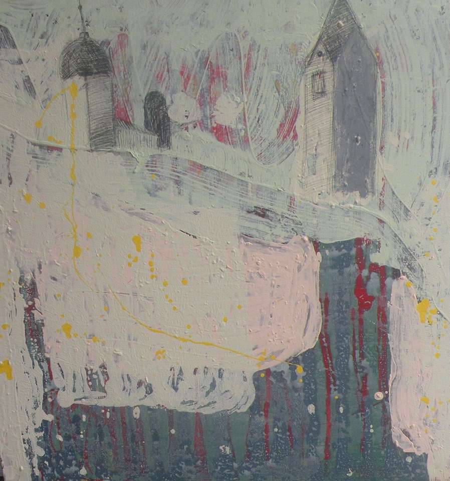 Obraz emanuje delikatną aurą tajemnicy, której sednem są pastelowe kolory. Jasny błękit, zderzający się z różowymi akcentami, tworzy kompozycję jak ze snu. Dominują tu kształty wież, które lekko przechylają się na tle abstrakcyjnych form, dając wrażenie niestabilności. Całość przypomina pejzaż namalowany na falującym płótnie. Od dzieła bije spokój, ale równocześnie gdzieś w nim czai się nuta niepokoju, jakby coś zaraz miało się wydarzyć. Artysta zastosował technikę impasto, co widać po chropowatych powierzchniach i wyraźnych pociągnięciach pędzla. Odcienie są subtelnie rozmazane, nadając obrazowi "dreamy" charakter. Dzieło może sprawić, że poczujemy się jak dzieci, które znalazły się w magicznym miejscu. Patrząc na nie, człowiek się zastanawia, co tam jest za tym wzgórzem? Może zamek z bajki, a może po prostu puste wzgórze. Różnorodność tekstur, od delikatnych smug po grube nawarstwienia farby, wzmacnia wrażenie, że nic tu nie jest przypadkowe. Mimo pewnej chaotyczności, obraz ma w sobie harmonię. Przywołuje refleksję nad przemijaniem i ulotnością chwil, jakby każdy kropelka koloru była złapaną myślą czy wspomnieniem.