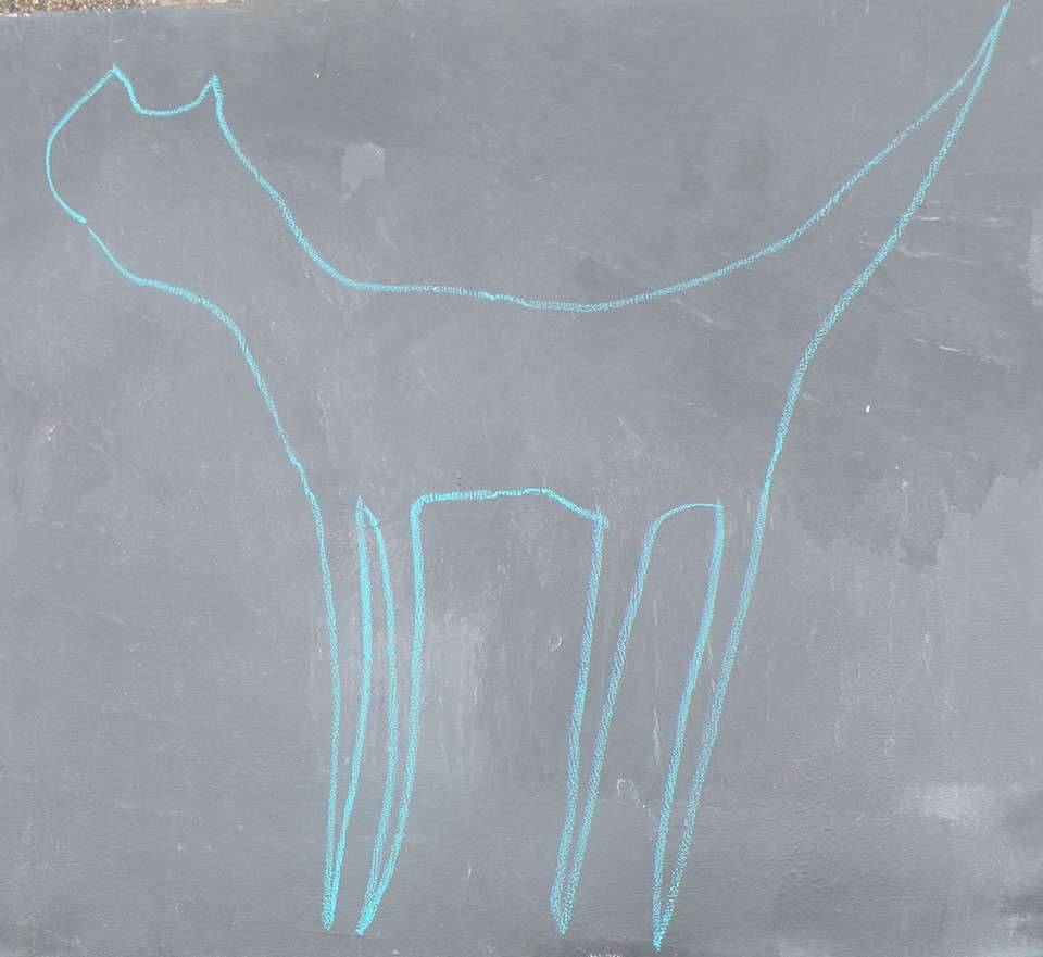 Rysunek przedstawia prostą sylwetkę kota narysowaną niebieską kredą na ciemnej powierzchni. Linia jest pociągnięta pewną ręką, ale zachowuje dziecięcą prostotę i niewinność. Tło, jednolite i szarzejące, kontrastuje z jaskrawym błękitem konturu. Przywodzi na myśl szkolną tablicę, na której ktoś spontanicznie postanowił uchwycić chwilę kreatywności. Atmosfera obrazu jest beztroska i lekka. Można poczuć ciepło i radość, jaką niesie za sobą akt twórczego wyrażania się. Sama linia jest dynamiczna, a jednocześnie zachowuje elegancję prostoty. Czuć tu echo sztuki naiwnej, ale też i jakby to powiedzieć, pure fun. Emocje płynące z tego rysunku są autentyczne i swobodne. Dla jednych to może być nostalgia za dzieciństwem, dla innych - inspiracja do działania. Dziecko mogłoby powiedzieć: "Narysowałem kota, i jest super!". Ta prostota i szczerość przyciąga i wywołuje uśmiech. Widać, że artysta nie bał się eksperymentować i po prostu cieszył się chwila. To simplicity uświadamia, że piękno tkwi często w najprostszych rzeczach.