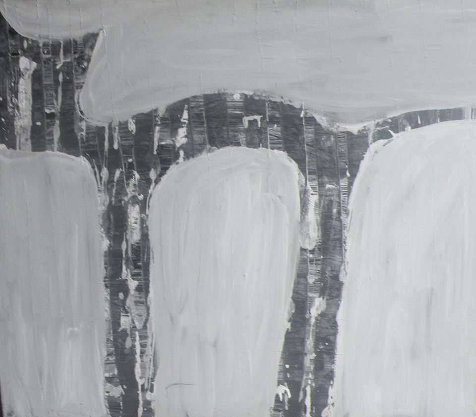 Na obrazie dominuje szarość, która tworzy intrygującą, niemalże industrialną atmosferę. Artysta wykorzystał grube pociągnięcia pędzlem, tworząc pionowe i poziome elementy – jakby kolumny unoszące się w mgle. Jasnoszare plamy kontrastują z ciemniejszymi, bardziej surowymi liniami, nadając obrazowi charakteru i głębi. Te kształty przypominają trochę zasłonę dymną, przez którą trudno jest dojrzeć szczegóły. Jakbym patrzył na miasto, które znika w porannej mgle. Styl jest dość surowy, co może sugerować wpływy abstrakcyjnego ekspresjonizmu. Technika, "brushstroke-like painting", przywołuje na myśl poszarpaną dynamiczność. Każda linia zdaje się być pełna emocji, niemalże niekontrolowana. Obraz wywołuje mieszankę spokoju i napięcia – jakby cisza przed burzą. Odbiorca może czuć się zarówno zaintrygowany, jak i lekko zaniepokojony. Chce się wsłuchać w ten wizualny hałas. Może też zobaczyć w nim metaforę zmagań, zagubienia w chaosie codzienności. Dla dziecka to może być prostsze. Widzę duże, szare chmurki. Interpretacje pozostają otwarte, a każdy może znaleźć coś dla siebie w tej dynamicznej "chmurze" emocji.