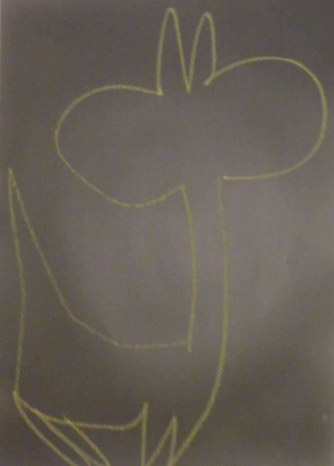Na obrazie widzimy prosty, żółty kontur na ciemnym tle. Linie są miękkie, zaokrąglone, przywodzące na myśl kształty, które można narysować jednym pociągnięciem kredy. Kompozycja jest minimalistyczna, dominuje pustka, która wprowadza nastrój spokojnej zadumy. Artysta posłużył się techniką rysunku kredą, co dodaje pracy delikatności i subtelności. Choć dzieło jest proste, może wywoływać szeroki wachlarz emocji. Dla jednych będzie to zabawny, dziecinny szkic, inni zobaczą w nim abstrakcyjne przedstawienie zwierzęcia. To intrygujące! Praca emanuje pewną beztroską, jak odręczny szkic dziecka - "To jest mój zeszyt do rysowania!". Taka swoboda formy wprawia odbiorcę w stan refleksji nad pięknem niewymuszonej sztuki. Można poczuć, jakby artysta próbowal oddać ulotność chwili. A może to tylko zwykły doodle? To wszystko otwiera pole do osobistych interpretacji. I to jest właśnie magiczne w takich pracach - każdy widzi w niej coś innego.