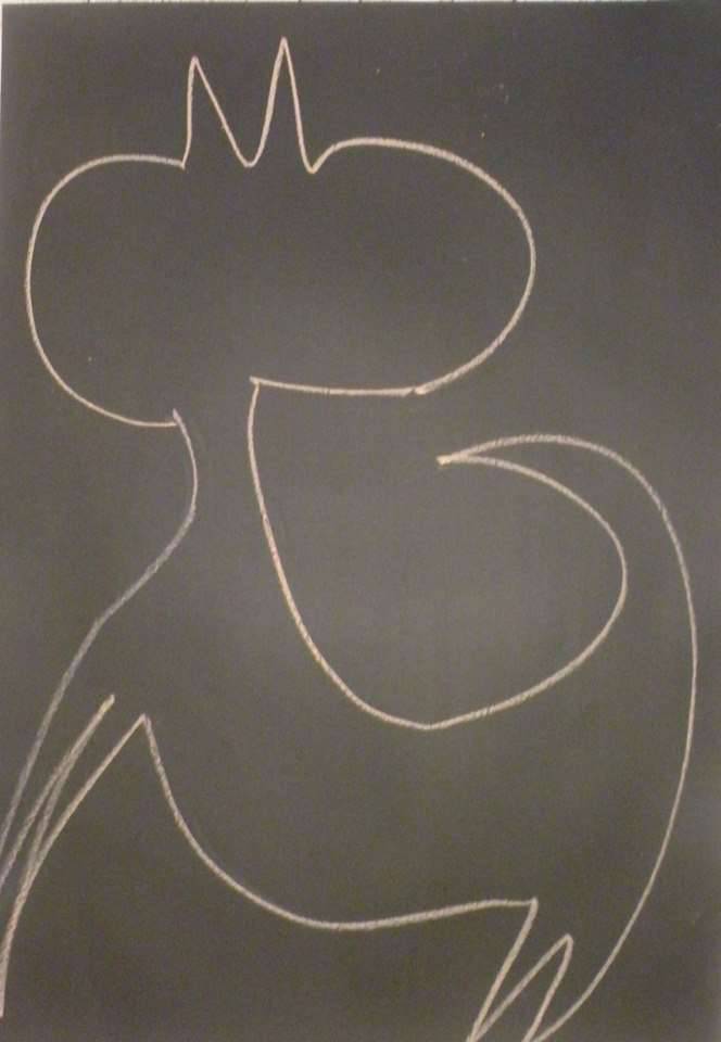 Na obrazie widzimy abstrakcyjny kształt na ciemnym tle. Prosta, biała linia tworzy kontur czegoś, co przypomina zarys zwierzęcia, może kota z dużą głową i spiczastymi uszami. Tło jest jednolite i ciemne, co sprawia, że jasna kreska wręcz "wyskakuje" na pierwszy plan. Obraz emanuje tajemniczością i pewną surowością. Styl przypomina dzieła z nurtu minimalistycznego. Zastosowano technikę kreskową, która jest jednocześnie prosta i wyrazista. Artysta ogranicza się do minimum środków wyrazu, co często skłania do głębokiej refleksji. Może to być hołd dla dziecięcej wyobraźni. "To kotek!" — powiedziałby maluch. Dzieło wywołuje różnorodne emocje. Na pierwszy rzut oka wydaje się zabawne i trochę intrygujące. Jednak po dłuższym wpatrywaniu, prostota obrazu otwiera pole do interpretacji. Czy to szukanie sensu w chaosie? A może piękno tkwi w prostocie i "simplicity" sceny? Ciekawi mnie, co zainspirowało twórcę do wyboru takiej formy. Może to była chwila zadumy? Albo spontaniczna myśl? Fakt, że jedno pociągnięcie linii może zainspirować do tylu refleksji, jest fascynujący. To właśnie siła sztuki — prosta, a zarazem głęboka w swej wymowie. To takie wciągające, zastanawiam się, co inni w tym widzą.
