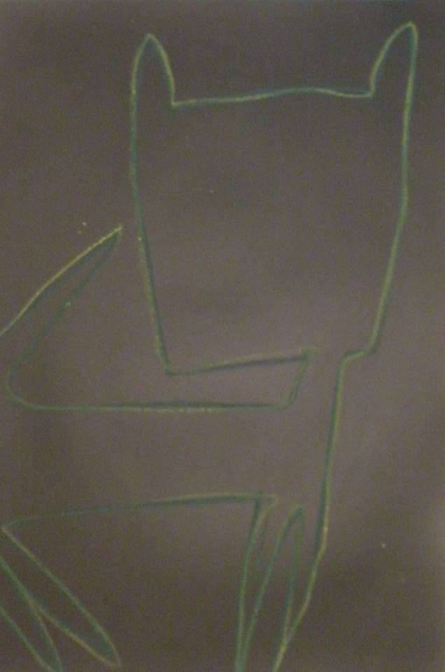 Na obrazie dominuje ciemne tło, które kontrastuje z najprostsza kreska zielonego konturu w centrum. Ścieżki kresek układają się w coś, co przypomina kontur zwierzęcia o spiczastych uszach. Może kot, może jakieś inne stworzonko? Atmosfera dzieła jest tajemnicza. Taka skromna, a jednocześnie przyciągająca uwagę. Artysta pewnie zastosował minimalistyczną technikę, operując głównie prostymi liniami i kontrastem między kolorem tła a konturu. To dzieło może wywołać u odbiorcy różne emocje. Jedni mogą poczuć spokój i świeżość, inni pewną nutę niepewności, takiej zagadki. "Co tu się dzieje?" - mogłoby zapytać dziecko. Liniowy układ i brak detali nadają obrazowi lekkość. Moja pierwsza myśl? Pure simplicity. W tej prostocie ukrywa się coś więcej. Ma to coś unikalnego, co sprawia, że zastanawiamy się nad większym sensem małych rzeczy.