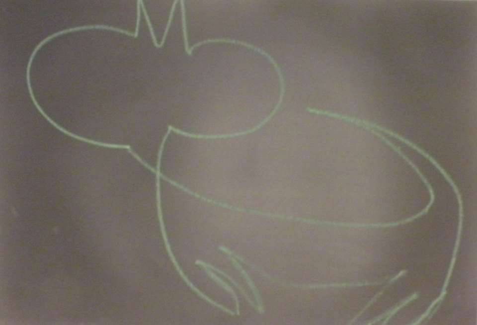 Na obrazie widać prosty, lekko nieporadny zarys postaci przypominającej kota, wykonany zieloną kredą na tablicy. Tło jest ciemne i matowe, co sprawia, że linie rysunku wydają się świecić. Kompozycja jest nieco chaotyczna, a kontury postaci są płynne, jakby dziecko bawiło się kredą na szkolnej tablicy. Widać tu ducha spontaniczności i zabawy. Styl rysunku przypomina dzieła w duchu minimalistycznej sztuki nowoczesnej. Choć prosta, ta forma potrafi uchwycić uwagę i budzi nostalgię za dzieciństwem. "To kotek!" - mógłby zawołać entuzjastycznie maluch. Idealnie oddane uczucie beztroski i szczerej radości z tworzenia. Sztuka ta przywodzi mi na myśl carefree days, kiedy nawet najprostsze linie mogły opowiedzieć całą historię. Z pozoru infantylne rysunki często niosą głębsze przesłanie o swobodzie i nieskrępowanym wyrazie emocji. Może właśnie dlatego patrząc na to dzieło, człowiek się uśmiecha.