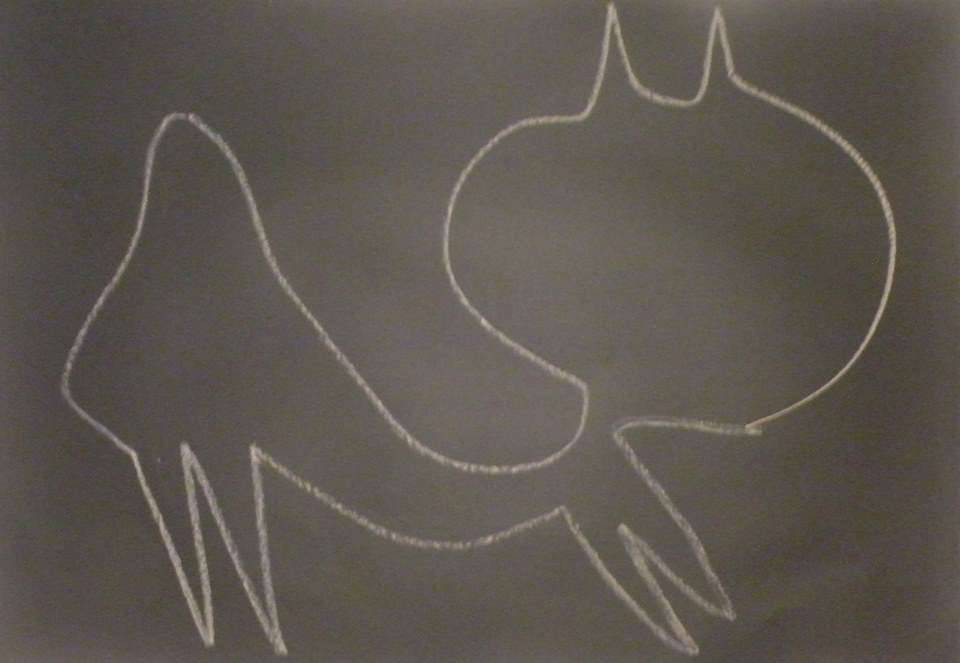 Na pierwszy rzut oka obraz wydaje się być prosty. Ciemne tło w kontraście z białą linią, która meandruje po powierzchni płótna. Linie falują, tworząc nieregularną kompozycję, która zdaje się przypominać abstrakcyjną sylwetkę zwierzęcia. Widoczne są zakrzywione kształty przypominające może głowę z rogami. Atmosfera obrazu jest tajemnicza i nieco surrealistyczna. Wystarczy choćby chwila, by wciągnąć się w ten nietypowy "maze" linii, który sprawia, że wyobraźnia zaczyna szaleć. Styl artystyczny tego dzieła można określić jako minimalistyczny, z pewnym urokiem niedopowiedzeń. Artysta zdecydował się na surowe, wręcz dziecięce kreski, które mogą wywołać nostalgię za beztroskimi czasami dzieciństwa. Myślę, że każdy, kto patrzy na ten obraz, może sobie wymyślić swoją historię. A może tak naprawdę jest to tylko losowy zygzak? Wywołuje uśmiech i lekkie wrażenie zagadki. Ogólnie rzecz biorąc, to trochę jak w kalejdoskopie emocji – proste, ale złożone.