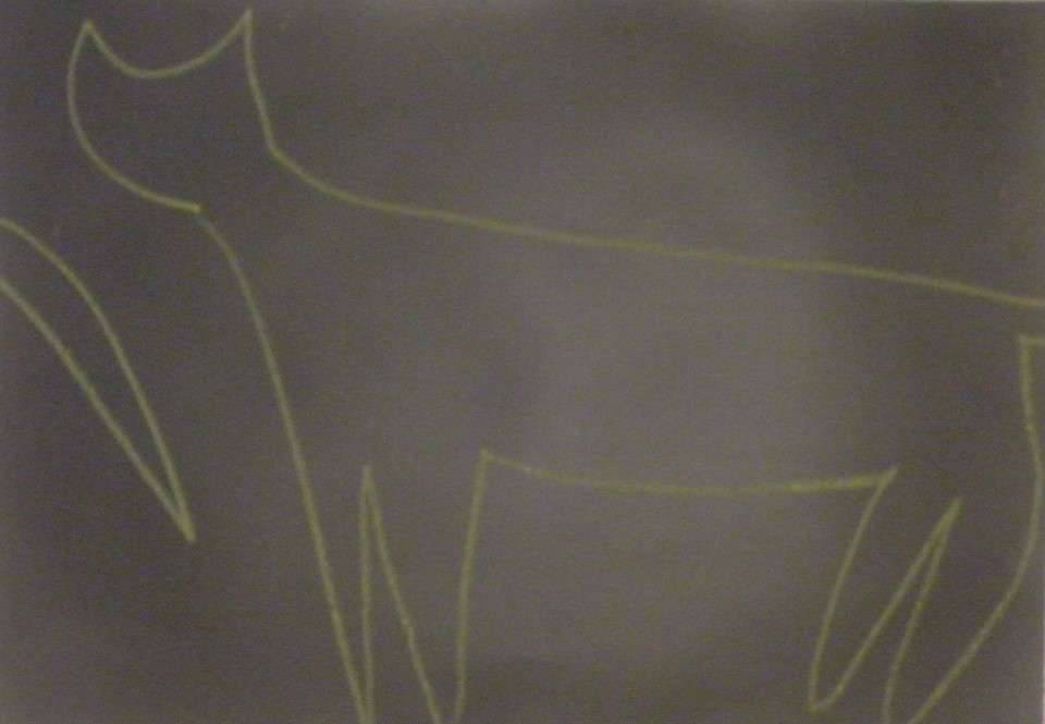 Na obrazie widzimy delikatny szkic kota, który został nakreślony żółtą linią na ciemnym tle. Zarys jest minimalistyczny, z przewagą prostych linii i kątów, co nadaje mu lekkości i poczucia przestrzeni. Kontrast między ciemnym tłem a jasnym konturem sprawia, że postać wydaje się niemalże unosić w powietrzu. Jest to kompozycja, która mocno przyciąga oko, choć jest subtelna i nienachlana. Nastrój dzieła jest spokojny i refleksyjny — jakby artysta próbował uchwycić esencję kota w kilku prostych kreskach. Technika ta z pewnością przypomina prace, gdzie less is more, co w tym przypadku jest trafne. Patrząc na ten obraz, można poczuć spokój, który często towarzyszy obserwacji zwierząt. Children might say: "To kotek, on milutki wygląda!" Może to być też pewien manifest artystyczny — próba podkreślenia piękna prostoty. W mojej osobistej refleksji, ta praca przypomina mi, jak ważne jest nieprzekraczanie granic w wyrażaniu siebie. Jest to też trochę jak list miłosny do minimalizmu, no nie? Gdy patrzysz na to, zyskujesz chwilę wytchnienia i może odrobinkę nostalgii za dzieciństwem, kiedy wystarczał kawałek kredy i tablica, żeby przenieść się w magiczne światy. To taki "moment of peace". Spodziewałem się czegoś bardziej skomplikowanego, ale to jest w tym właśnie jego urok.