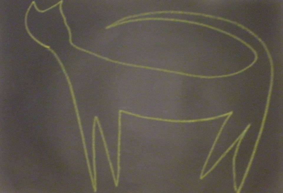 Na obrazie widać prosty, ale niezwykle wyrazisty zarys kota. Narysowany cienką, żółtawą linią na ciemnym tle, przywodzi na myśl rysunki, które każde dziecko robi kredą na tablicy. Kształt kota jest minimalistyczny, ograniczony do kilku gładko poprowadzonych linii. Tym stylem przypomina sztukę abstrakcyjną, w której prostota staje się środkiem do przekazania głębszej treści. Atmosfera dzieła jest lekka, niemal zabawna. Można poczuć ducha nieformalności i spontaniczności, jakby artysta chciał przekazać nam uczucie beztroski. Technika rysunku sugeruje swobodę i pewność, kajnd of jakby linia sama wiedziała, którędy biec. Dzieciak mógłby powiedzieć: "To kotek rysowany kijem na piasku!". Takie dzieło może u odbiorcy wywołać uśmiech, wspomnienie dziecięcych zabaw lub refleksję nad pięknem tkwiącym w prostocie. Przypomina, że często najprostsze formy potrafią wyrazić najwięcej. Patrząc na to, można się zastanowić, jak często warto powrócić do podstaw i dostrzec coś więcej, niż tylko kontur na ciemnym tle.