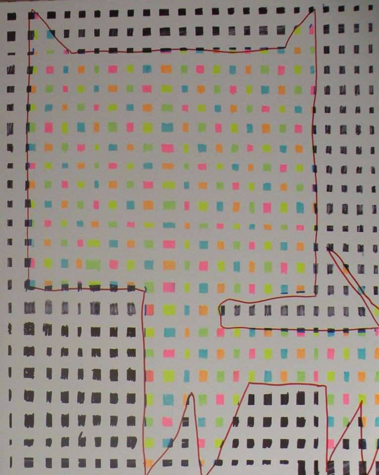 Obraz to prawdziwa eksplozja kolorów i kształtów. Dominują różnobarwne kwadraciki: różowe, niebieskie, zielone, pomarańczowe, rozprzestrzenione w uporządkowanym chaosie. Króluje geometryczna kompozycja, jakby ktoś starannie zaplanował każdy centymetr płótna. Czarna obramówka delikatnie ożywia kontury postaci przypominającej kota, nadając całemu dziełu nieco abstrakcyjny twist. Wydaje się, że artysta postawił na minimalizm i precyzję. Nastrój jest radosny, intensywny, niemalże dziecięcy. Przywodzi na myśl kolorowankę, którą wypełnia się bez planu, kierując się jedynie fantazją. Użycie wyrazistych kolorów w zestawieniu z czernią nadaje obrazowi dynamiczną energię. It's vibrant! Technika wydaje się oparta na wykorzystaniu prostych, odważnych form, co przyciąga wzrok i nie pozwala oderwać się od płótna. Drobne niedoskonałości, prawie jak literówki w tekście, nadają mu autentyczności. "To kot, bo ma takie uszy!" – powiedziałoby dziecko. I może ma rację. Ta abstrakcja budzi wiele emocji: śmiech, zadumę, a może i zdziwienie. Każdy znajdzie w niej coś dla siebie. Patrząc na to dzieło, czuję się jak w środku beztroskiego snu, pełnego kolorów i niespodzianek.