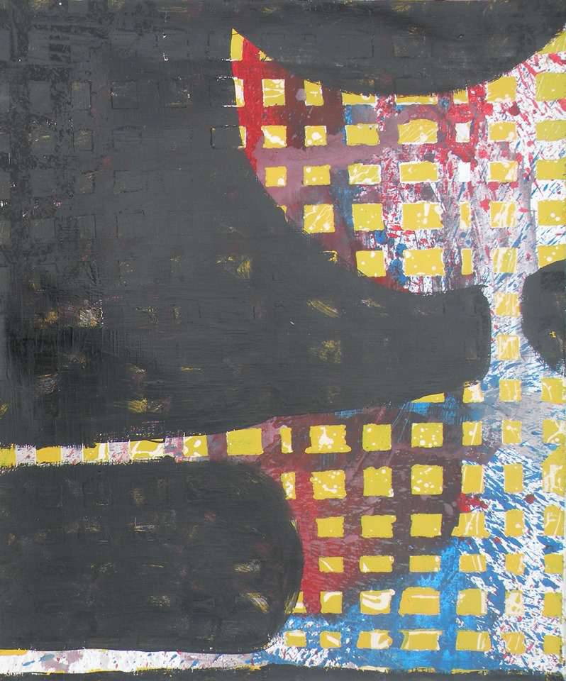 Obraz emanuje dynamicznym zestawieniem kolorów i form. Czarne plamy kontrastują z żółtymi kwadratami, które tworzą swego rodzaju kratkę. Te geometryczne wzory przypominają trochę retro pixel art, dając wrażenie kontrolowanego chaosu. W tle przebijają się czerwone i niebieskie akcenty, dodając kompozycji głębi. Wygląda to jak abstrakcyjny taniec kształtów na płótnie, który przykuwa wzrok. Nastrój obrazu jest jednocześnie tajemniczy i optymistyczny. Ciemne elementy przyciągają uwagę, ale pastelowe kwadraty wprowadzają nutę radości. Można się w tym totalnie pogubić jak w labiryncie myśli. To fascynująca gra światła i cienia. Styl artysty jest bardzo expresive, lekko surowy, ale też pełen subtelności. Technika, jaką użył, to prawdopodobnie mieszanka akrylu i oleju, co dodaje intensywności. Patrząc na to dzieło, można poczuć niekończącą się możliwość interpretacji. Jednego dnia to może być futurystyczna mapa miasta, innego – emocjonalny krajobraz uczuć. Jakby to powiedziało dziecko: "To jest jak wielka czarna chmurka w kolorowym niebie". Osobiście czuję się zaintrygowany i lekko zdeziforentowany. A może to właśnie klucz do zrozumienia tej sztuki – unpredictability. I mimo że nie wiem, co artysta chciał przekazać, czuję, że właśnie o to chodziło – o eksperyment.