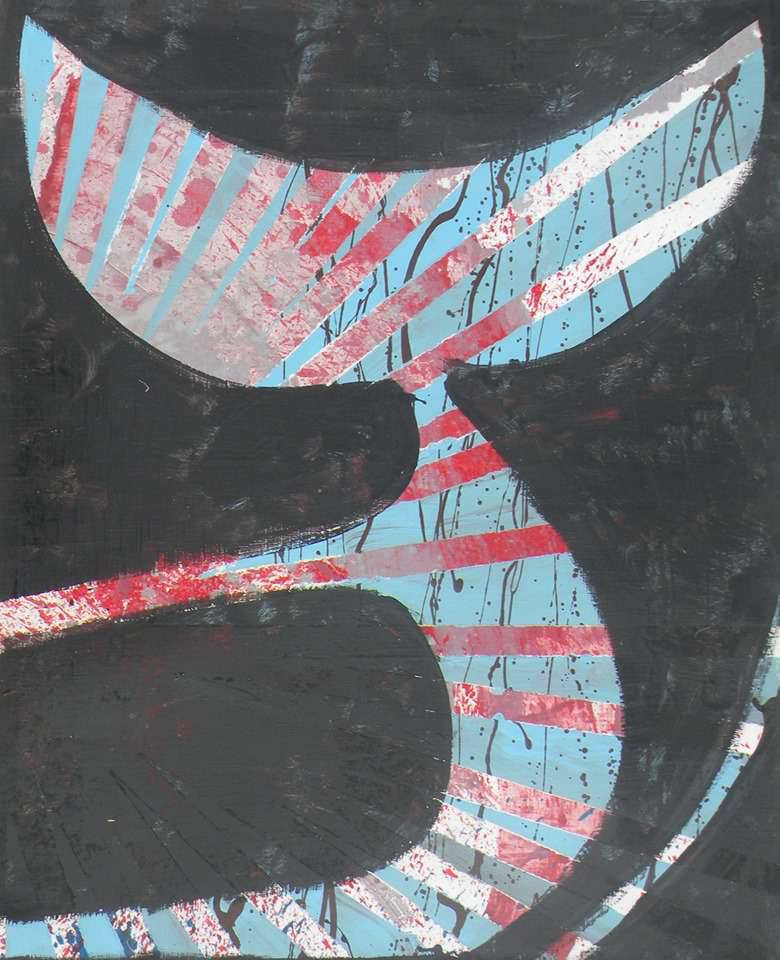 Na obrazie dominują kontrasty między czernią a jasnymi kolorami. Przez ciemność przebijają się czerwone i niebieskie paski, nadając dziełu dynamiczną strukturę. Kształty są geometryczne, jakby wycięte z abstrakcyjnego snu. Kompozycja przyciąga wzrok, prowadząc go po liniach niczym labirynt. Atmosfera obrazu to swoisty niepokój zmieszany z ciekawością – chaos i harmonia w jednym. W stylu czuć inspirację abstrakcyjnym ekspresjonizmem, z odrobiną street artu. Ostre kolory i dynamiczne kształty przypominają graffiti. Wow, jakie to fajne! Użyte techniki takie jak rozpryski farby przywodzą na myśl spontaniczność i wolność twórczą. Obraz może wywoływać emocje od podziwu po intrygę, skłaniając do refleksji o nieprzewidywalności świata. Dla mnie to jak fragment "dream" z szalonego świata, pełen ukrytych znaczeń. Te wyraziste linie i kolory prowokują do zastanowienia się, co naprawdę kryje się za tym artystycznym chaosem.
