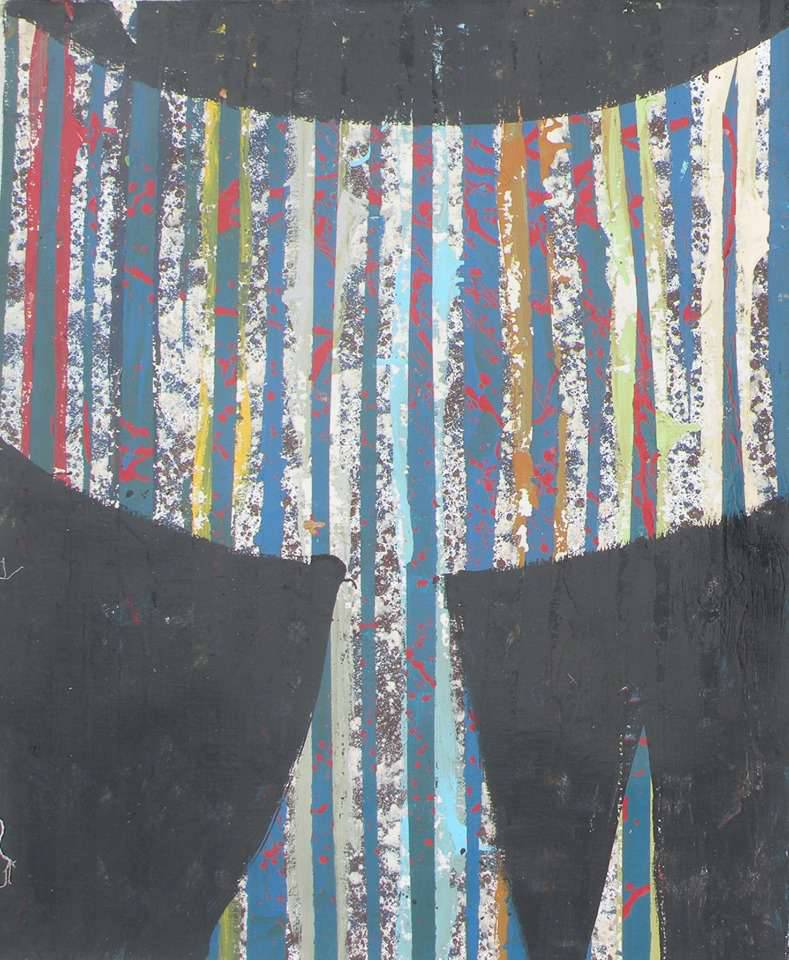 This abstract painting presents a vibrant interplay of vertical stripes, each standing like a colorful beacon against the juxtaposed dark forms. The stripes are a riot of blues, reds, yellows, and whites, blending and contrasting, creating rhythmic patterns that seem to pulse with energy. It's like a rainbow got a little messy and decided to stay that way. The dark shapes at the top and sides create a frame, possibly hinting at something beyond, something hidden. The overall mood is dynamic and lively, a dance of colors that almost sing. There's a certain rawness to the texture and application of paint, suggesting the artist's decisiveness and spontaneity. This creates a sense of freedom and playfulness, as if the canvas itself is alive, humming "I'm here." "The stripes look like candy!" a kid might exclaim, capturing the innocent wonder this piece can evoke. The style borders on modernism, with a touch of expressionist boldness. The technique uses brushstrokes and layering to achieve depth and movement. It's "expressive," in the truest sense of the word. Emotions can range from joy to curiosity, prompting viewers to reflect on the harmony and chaos in life. It might make you think about how colors can both clash and harmonize, much like life's contradictions. In essence, it's a feast for the eyes and a puzzle for the mind, inviting interpretation and reflection with every look.