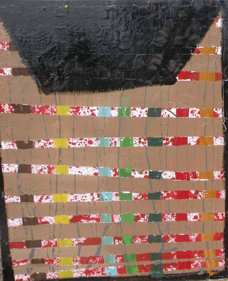 Obraz, który mamy przed sobą, to prawdziwa eksplozja kolorów i kształtów. Na pierwszy plan wysuwają się jasne, wielobarwne paski, które przecinają płótno niemal jak tęczowe wstęgi. Dominują brązowe i czerwone tony, przeplecione kapryśnymi plamkami bieli i zieleni — zupełnie jak confetti rozrzucone na przyjęciu. Nad tym wszystkim góruje ciemna, niemal abstrakcyjna plama czerni na górze obrazu, jak nocne niebo w deszczowy dzień. Atmosfera jest lekko chaotyczna, przypominająca dzieło artysty na chwilę przed jego ukończeniem, pełna energii i pewnego spontanicznego uroku. Artysta korzystał z odważnych pociągnięć pędzla, nadając fakturze głębię i intrygującą chropowatość. Technika wydaje się być luźna, swobodna, taka trochę free-style, co nadaje całemu dziełu niepowtarzalny charakter. Patrząc na ten obraz, czuję się ożywiony, jakbym złapał kawałek dzikiej, nieokiełznanej kreatywności. Może to przypominać miasto w ruchu — pełne życia. Jak gdyby artysta powiedział: “Hej, spójrz! Zobacz jak życie pulsuje w każdym kawałku świata”. Myślę o tym, jak dziecko mogłoby opisać: "To wygląda fajnie, jak kolorowa zabawa!". Dla niektórych może być to po prostu wzór, ale dla innych, wymaga refleksji nad chaosem i harmonią życia.