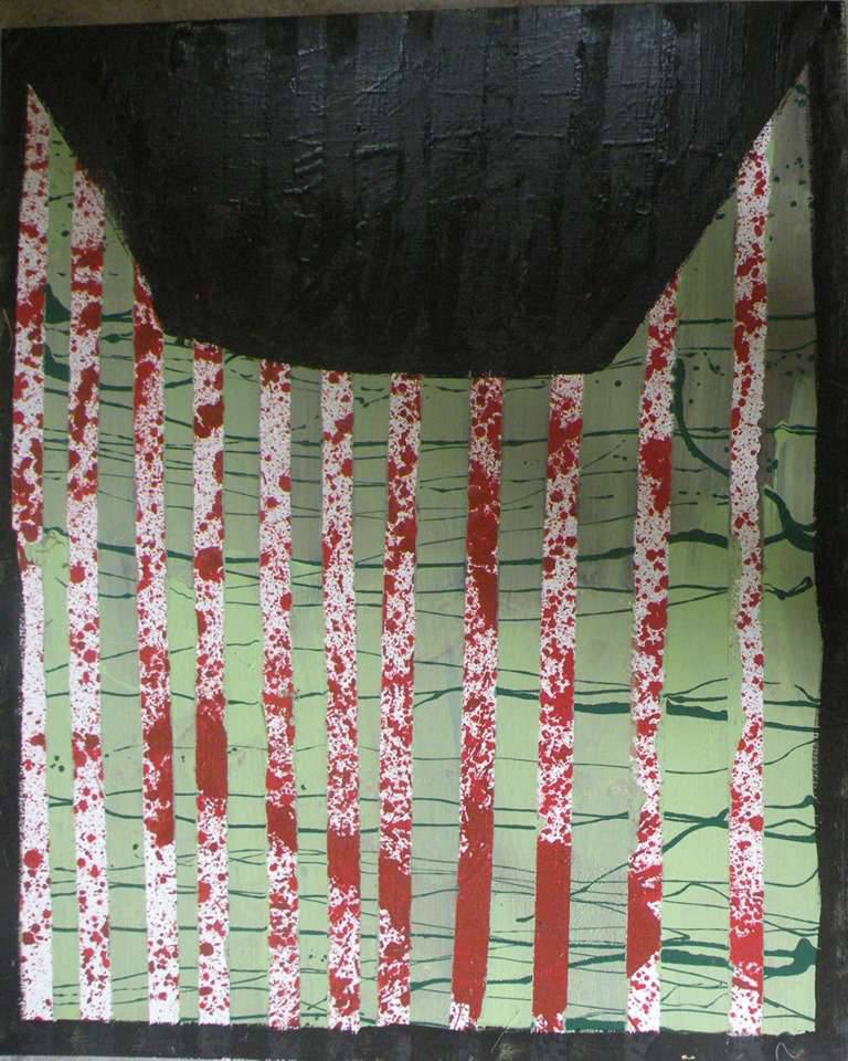 Na obrazie dominują odcienie zieleni, czerwieni i czerni. Tło w jasnej, stonowanej zieleni przecina się przez intensywne, czerwone paski, które są nieco niedbałe, jakby artysta malował w pośpiechu lub z wielkim impetem. Czerń w górnej części tworzy kontrast, przywodząc na myśl sufit, może dach. Obraz jest troszkę jakby "chaotic", choć układ pasków wnosi element porządku. Atmosfera dzieła jest raczej surowa i nieco tajemnicza. Ktoś mógłby powiedzieć, że to trochę jak muzyka w deszczowy dzień. Technika użyta przez twórcę, przypomina współczesny minimalizm, z odrobiną abstrakcyjnej ekspresji. Artysta zdaje się bawić teksturą, bo paski są nałożone na siebie niejednorodnie, co dodaje obrazu dynamizmu. Gdyby dziecko spojrzało na ten obraz, mogłoby powiedzieć: "To wygląda jak wielkie zielone ściany w moim pokoju". To jednak nie koniec. Dla dorosłego widza ten obraz może być także medytacją nad chaosem i harmonią, odzwierciedleniem wewnętrznych zmagań. Inny myśląc, może poczuć nutę niepokoju lub intrygi. Dla mnie to przypomnienie, że sztuka nie musi być doskonała, by poruszać i inspirować.