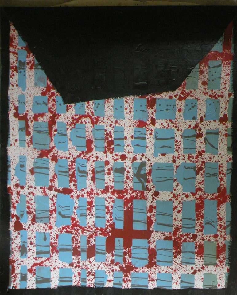 Obraz emanuje chaosem i żywiołowością, przyciągając wzrok intensywną mieszanką czerwieni, błękitu i różnych tonacji czerni. Kolor czerwieni rozlewa się niczym strugi krwi, tworząc dynamiczne plamy i kształty na tle błękitnych prostokątów, które zdają się być nierównomiernie rozmieszczone. Czarny, nieregularny kształt na górze dodaje tajemniczości i dramatyzmu, jakby obraz miał coś ukrywać przed obserwatorem. To wszystko tworzy surowy, niemal agresywny nastrój, budzący skrajne emocje. Technika artystyczna opiera się na kontrastach kolorystycznych i teksturze. Błękitne prostokąty zdają się być gładkie, podczas gdy czerwone rozpryski dodają chropowatej energii. Artysta prawdopodobnie stosował technikę drip painting, która nadaje dziełu ekspresyjność i nieprzewidywalność. Malarstwo wydaje się mówić “look closer!”, zmuszając do refleksji nad porządkiem i chaosem w ludzkim życiu. Obraz może budzić niepokój, jakby ktoś się o coś kłócił. A może dziwić, bo przecież dzieci też tak malują, prawda? Dla niektórych to jak scena z filmu, pełna napięcia i niespodzianek. Patrząc na to dzieło czuć pewną dzikość, która może inspirować do własnej interpretacji tego, co naprawdę widzimy.