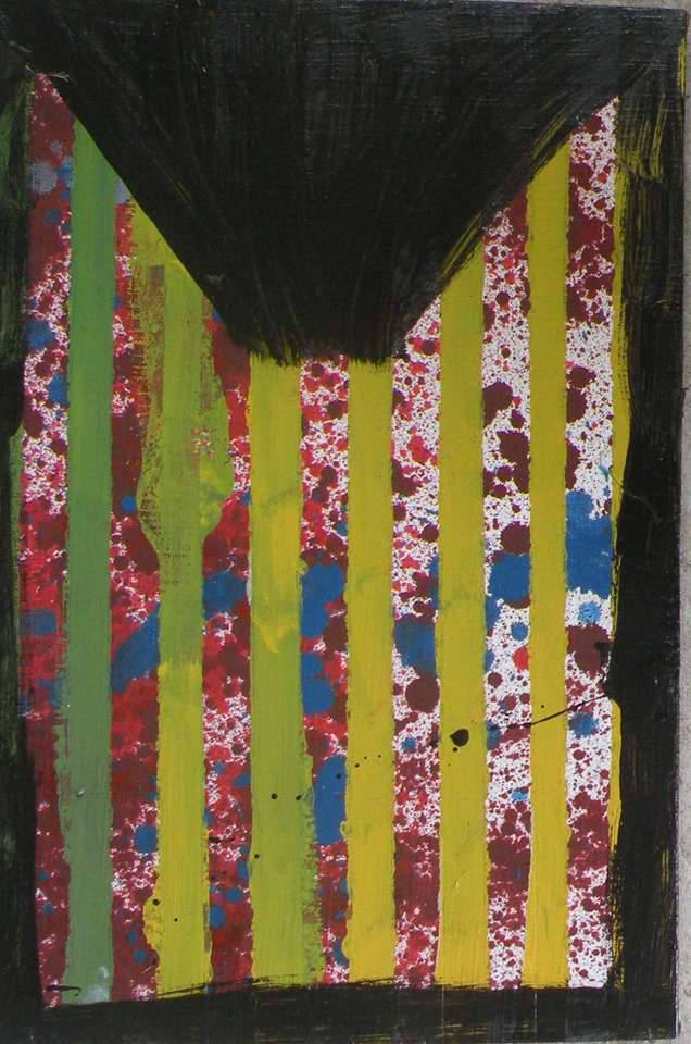 Obraz eksploduje intensywnością kolorów. Widzimy pionowe pasy w odcieniach zieleni i żółci, które zdecydowanie kontrastują z czerwono-niebieskimi plamami tła. Te różnorodne kształty, od linii po chaotyczne plamy, tworzą kompozycję pełną dynamiki. Czarny trójkąt w górnej części jest jakby z innego świata, wprowadza nutę tajemniczości i głębokości. Dzięki temu całość przypomina abstrakcyjny pejzaż, oddziałujący na wyobraźnię. Atmosfera obrazu jest dość zagadkowa. Trochę jakbyśmy byli w jakimś dziwnym śnie, gdzie wszystko jest możliwe. Techniki artysty można by określić jako mieszankę ekspresjonizmu z nutą street artu. To połączenie sprawia, że dzieło jest żywe i nieprzewidywalne. Emocje, jakie może wywoływać, to przede wszystkim zdziwienie i fascynacja – czymś nowym, nieznanym. Może też trochę skupienia, bo trzeba chwilę się wpatrywać, żeby ogarnąć wszystkie szczegóły. Obraz potrafi naprawdę "złapać" obserwatora. Zastanawiasz się, co autor miał na myśli, czy to wyrażenie chaosu współczesnego świata? Może to tylko ja, ale czuję, że to welcome do innego wymiaru. Ach, dzieciak by powiedział: "To taki kolorowy miszmasz!" Ciekawe, ile różnych interpretacji może wzbudzić ta praca. Naprawdę sprawia, że się zatrzymujesz i myślisz. Pięknie skomplikowane.