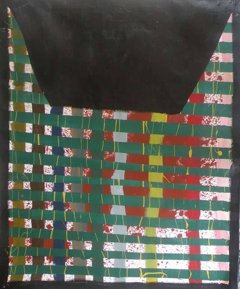 Obraz przedstawia dynamiczną kompozycję, która przyciąga uwagę swoją intensywnością kolorów. W centralnej części dominują pasy zieleni, czerwieni i bieli, ułożone w przekątne, które tworzą wrażenie ruchu i głębi. Na pierwszy rzut oka wydaje się to być prosty wzór, lecz gdy przyjrzymy się bliżej, dostrzeżemy subtelne niuanse w tonach i fakturach. Dominująca czerń w górnej sekcji dodaje odrobiny dramatyzmu, kontrastując z kolorowym splotem poniżej. To jakby ciemna noc spotykała się z kolorowym dniem. Nastrój obrazu wydaje się przytłaczający, niemal melancholijny, ale jednak z nutą optymizmu skrywaną w barwach. Styl artystyczny ma coś z abstrakcji, wykorzystując techniki mieszane farb na płótnie. Ciągnące się kolorowe pasy wyglądają jak ręcznie tkane, co dodaje im organicznego feel. Patrząc na to dzieło, można poczuć się zagubionym w kalejdoskopie emocji. Może to być radość odkrywania, smutek przemijania albo po prostu zagadkowa myśl. Myślę, że ktoś mógłby powiedzieć: "To wygląda jak kolorowe cegiełki, które układają się jak w mojej układance!". Takie personalne refleksje wywołują głębsze zaangażowanie. A jeśli szukać tu jednego słowa po angielsku, to "intriguing" świetnie uchwyciłoby istotę tego obrazu.